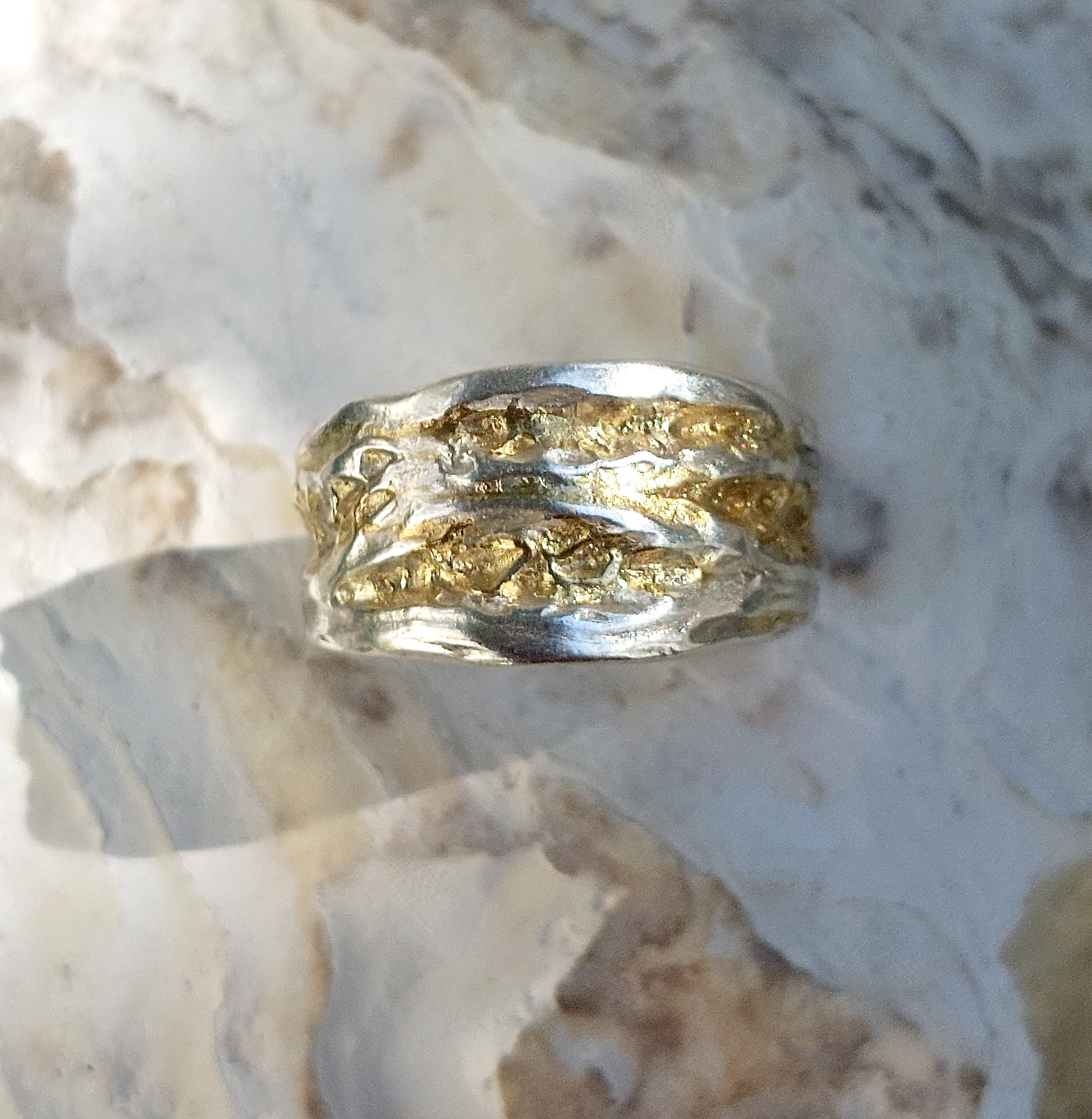Agua dorada - Een schitterende zilveren ring waar het goud als water doorheen stroomt. Levendig en wervelend, energiek en vitaal. Een ring voor alledag, een die je nooit meer afdoet. Verguld met 24 krt goud met de Japanse Keum Boo techniek, waarbij het goud samensmelt door verhitting met het zilver. Duurzaam en slijtvast. Made for you, inspired by Nature