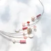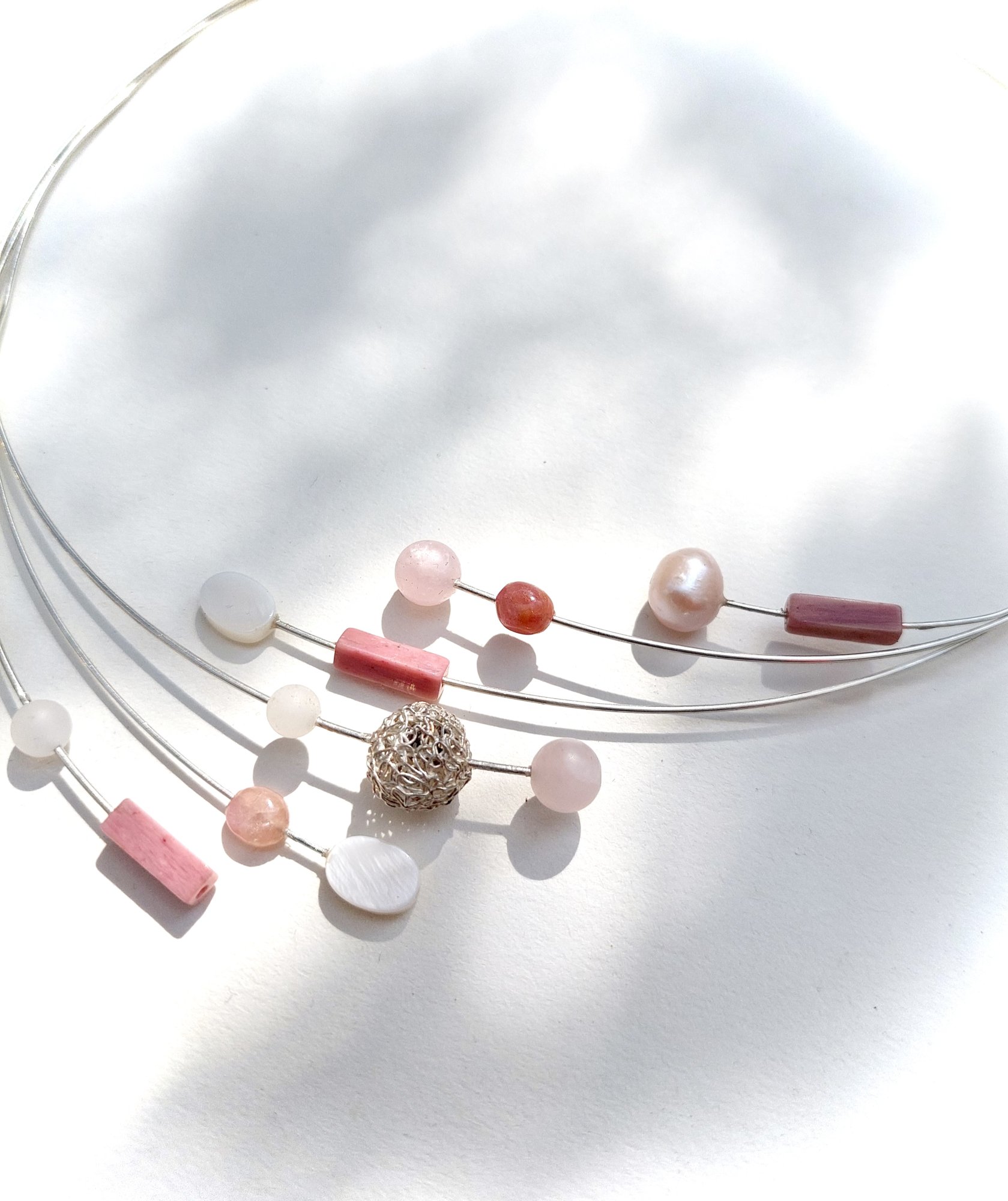 Primavera Rosa - Zilveren asymmetrisch collier met speelse elementen. Een charmante knipoog naar de beroemde Italiaanse wielerwedstrijd voor vrouwen. Dit aparte collier is versierd met filigrain, rhodoniet, rozenkwarts, parels en parelmoer. Een bijzonder, exclusief en fraai halssieraad om het voorjaar te omarmen!