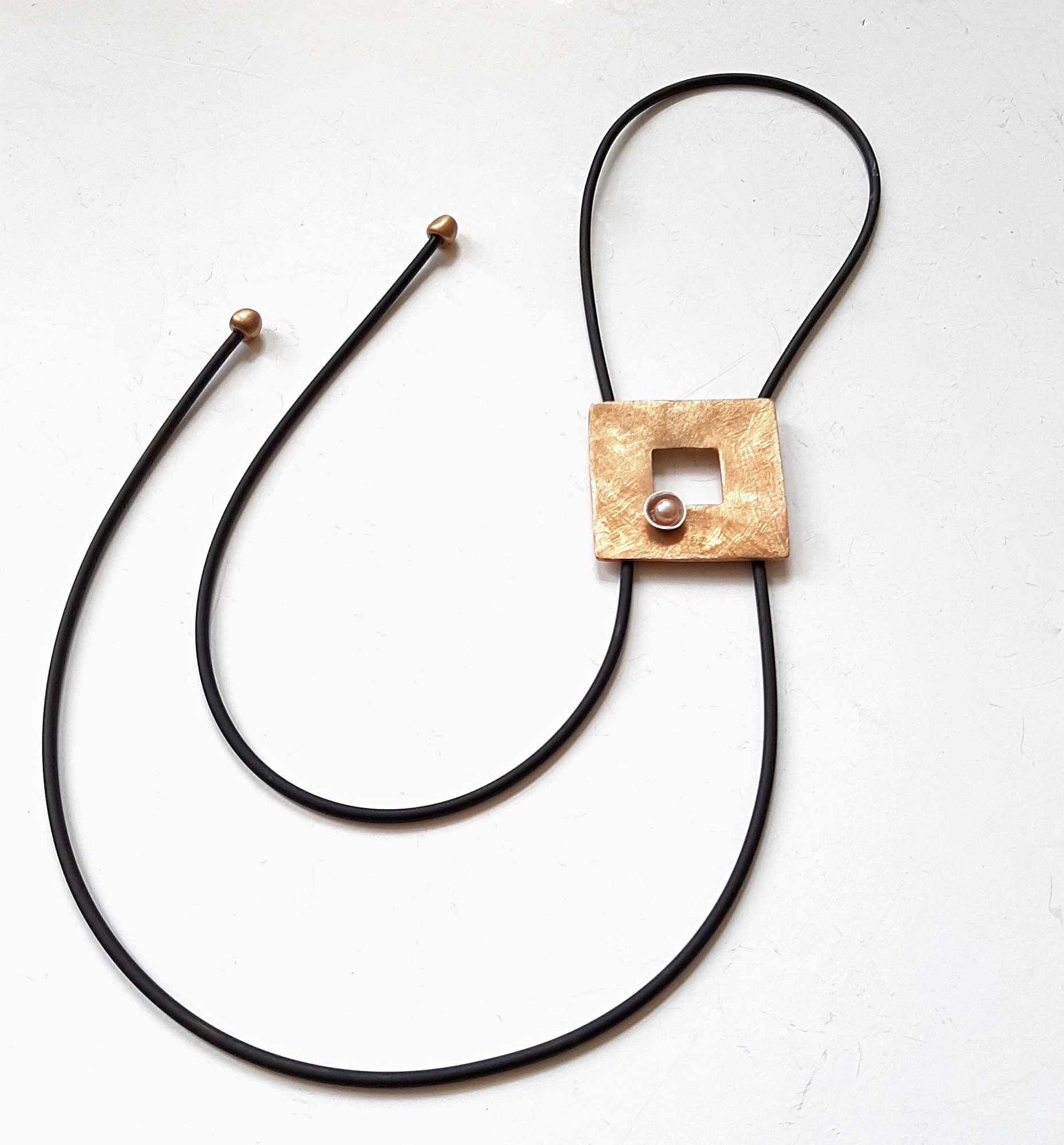 CoCo Perla - Deze aparte goudkleurige hanger is versierd met een sierlijk zacht rose zoetwaterparelje. Het brushpolished afgewerkt brons heeft een warme uitstraling en draagt soepel aan de zwart rubberen veter. Eenvoudig in hoogte verstelbaar. De uiteinden zijn met handgemaakte goudkleurige bronzen pareltjes afgewerkt. Combineer met de CoCo Perla oorbellen!
