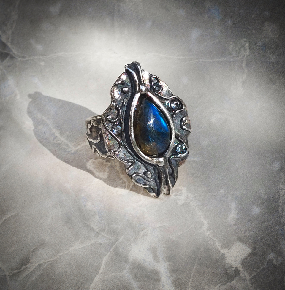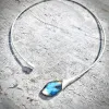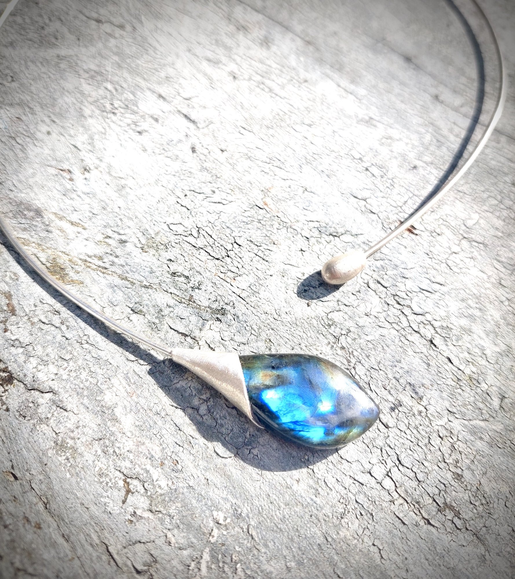 Labradoriet Magique - Zilveren asymmetrische spang. Een stijlvol halssieraad met een schitterende Labradoriet gevat in een zacht mat zilveren omhelzing. De labradoriet is een beschermende steen bij uitstek, niet dat je hem daarom moet dragen, want steen heeft een diepe gelaagdheid en een bijzondere schoonheid. De lichtval haalt de intense blauwe/groene/gouden kleur naar boven, en is steeds weer anders. Een juweeltje. Inspired by nature, made for you