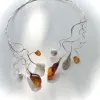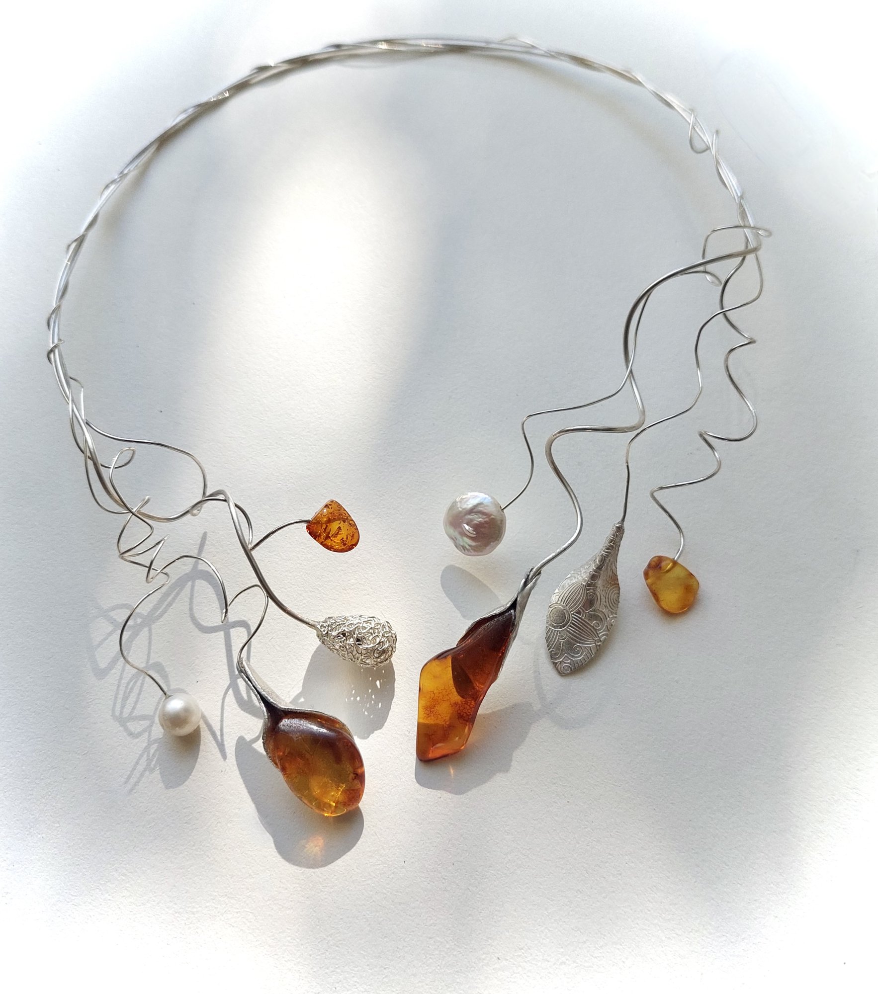Allegria ll- Een feestelijk zilveren halssieraad waarmee je het leven met al zijn bijzondere, speciale en kostbare momenten kunt vieren! Gouden en zilveren bladvormen kringelen aan goud en zilverdraad sierlijk om je hals. Het collier is gedecoreerd met zoetwaterparels, amethist, amazoniet, groene en oranje agaat. Een absoluut unicum.