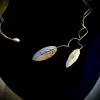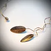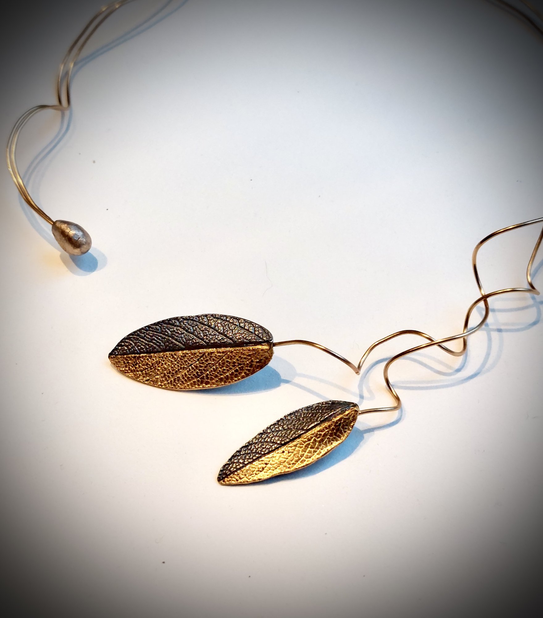 Classico Saggio - Aparte spang met zilveren blaadjes met de organische structuur van salieblad - De zilveren blaadjes zijn donker gepatineerd en deels verguld met 24 krt goud. Het asymmetrische collier zelf bestaat uit verguld draad, afgewerkt met een handgemaakte goudkleurige bronzen parel. Een elegant, feestelijk, uniek en stijlvol halssieraad.