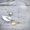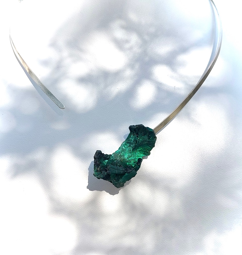 Enchante- Zilveren asymmetrisch collier met betoverend element van organische gevormde Malachiet. De prachtige zilveren platte spang draagt licht en soepel. Malachiet staat voor transformatie, liefde en balans. De steen is afgewerkt met een beschermende coating. Een uniek en bijzonder sieraad.