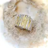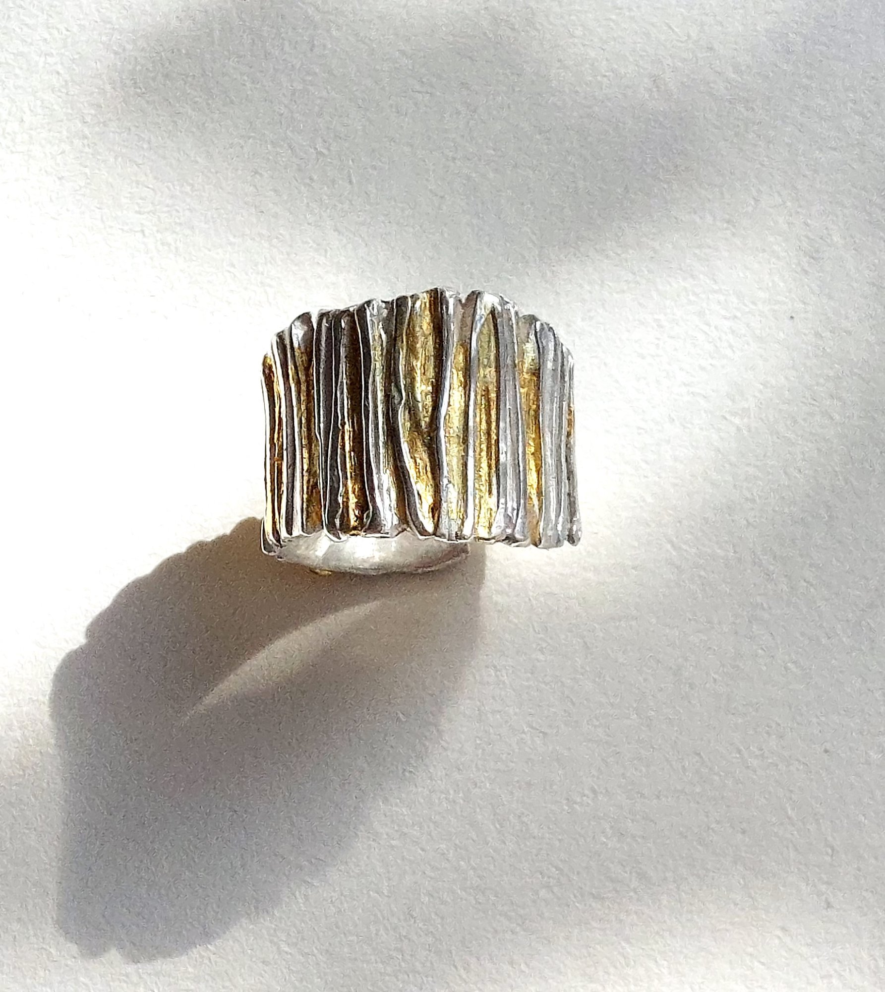 Oro Listrado - Unieke zilveren ring met 24 karaat vergulde cannelures. Boombast structuren zijn de inspiratiebron voor deze organisch vormgegven ring. Stijlvol en warm. Het 24 krt goud is aangebracht via de Japanse Keum Boo techniek, waarbij het goud en het zilver door verhitting een alloy maken, met elkaar samensmelten in een duurzame verbinding.