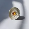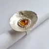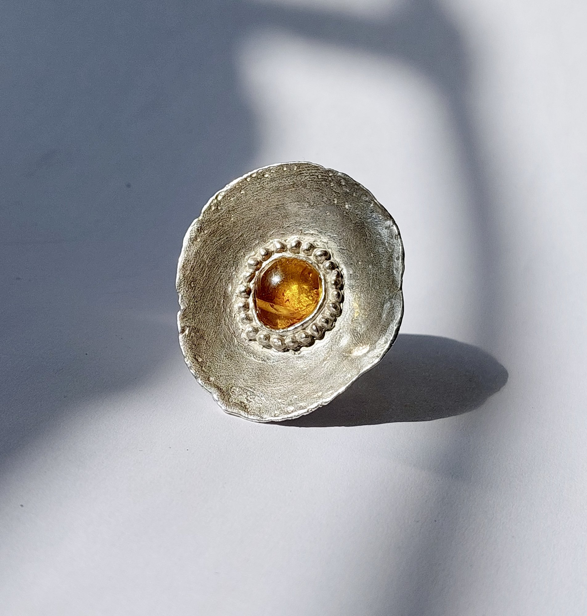 Amber - Een ring van formaat met Barnsteen. Uniek en zeer apart ontwerp. Het zilver heeft een aparte organische structuur en is afgewerkt met handgevormde zilvere pareltjes. Barnsteen wordt ook wel amber genoemd. Het is een fossiel hars van miljoenen jaren oud. Opmerkelijk warm en honingachtig geel tot roodbruin van kleur. De ring kan op bestelling worden gemaakt. Alle ringen worden handgemaakt en zijn uniek. Er kan verschil zijn met de ring op de getoonde afbeelding.