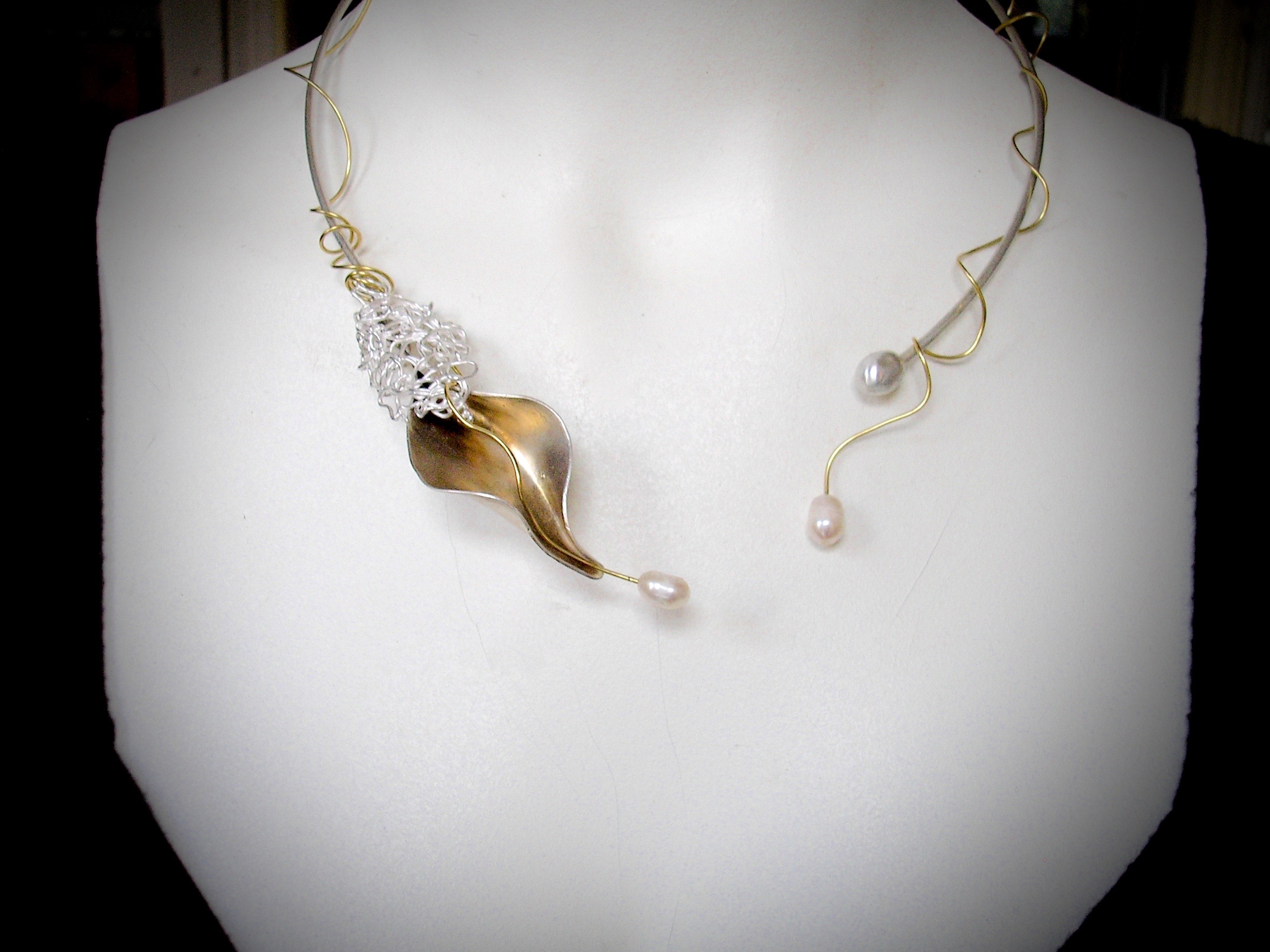 Ucella - Elegant en sierlijk en betoverend sieraad. Met een licht gepatineerd zilveren kelkje en een filigrian zilveren element aan de zilveren spang met gouddraad gelardeerd. Afgezet met roomwitte pareltjes en een zilveren bolletje. Een fijn dragend zilveren spang met pareltjes, zilver filigrain en een warme touch van goud. Lets celebrate life