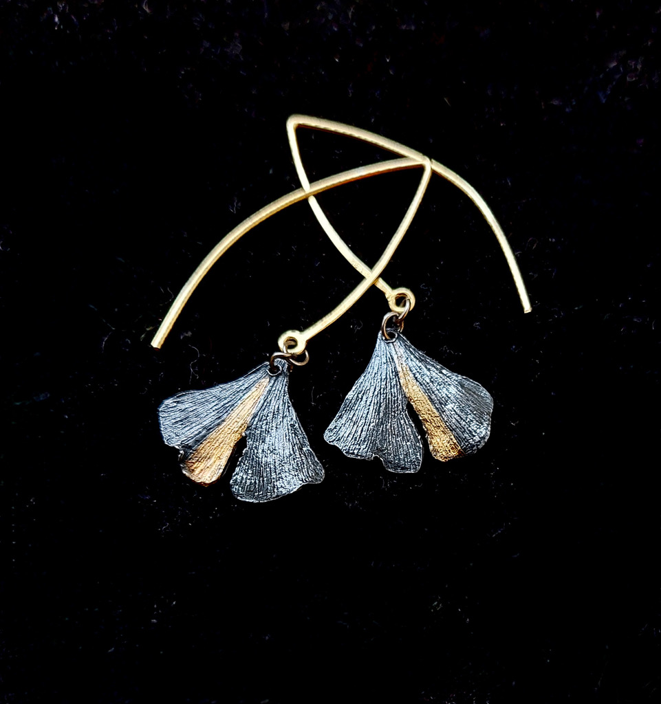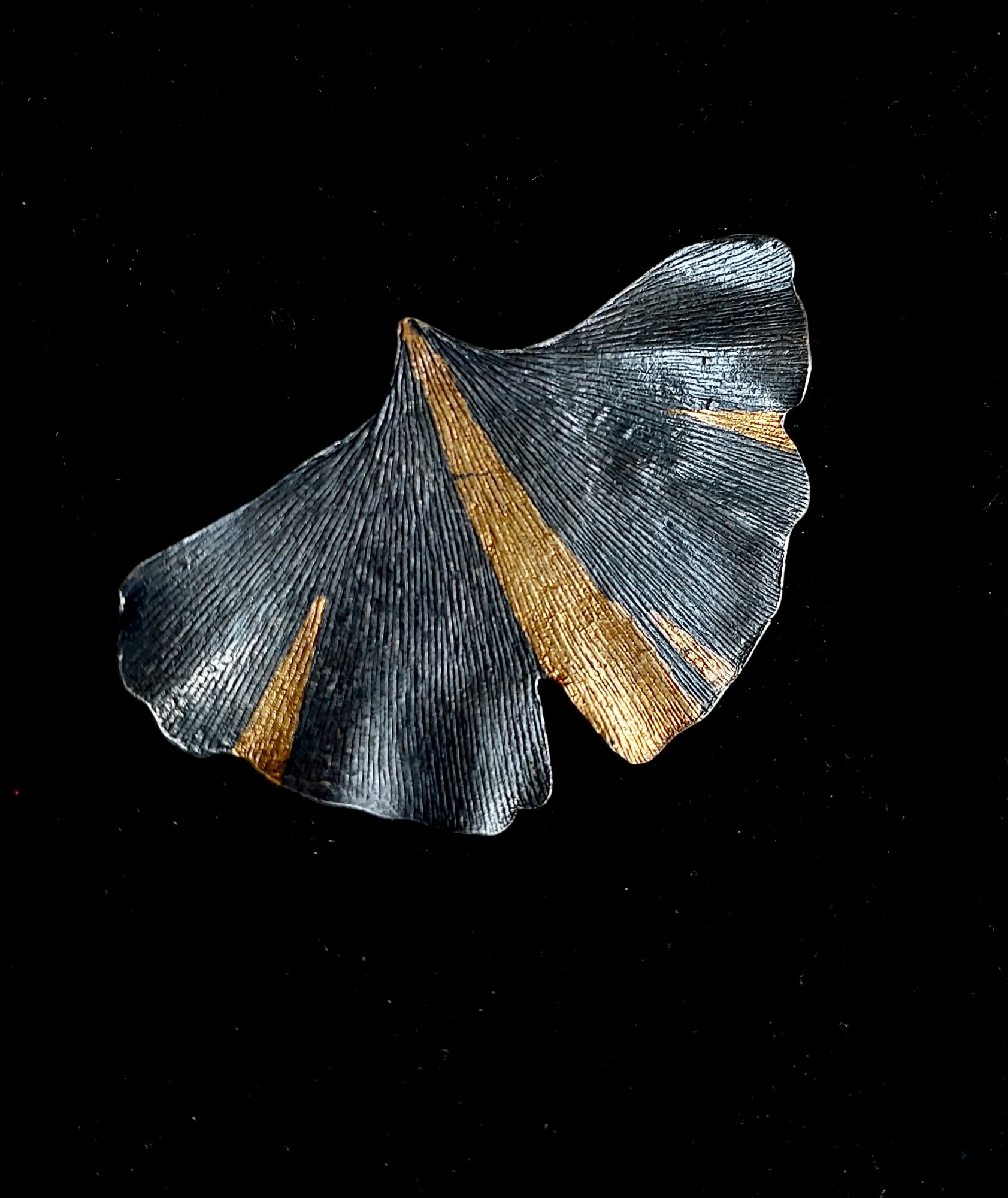 Ginkgo - Broche koper en goud. Mooie koperen broche met 24 karaat bladgoud elementen. Wordt bevestigd met zilveren brochespeld.