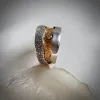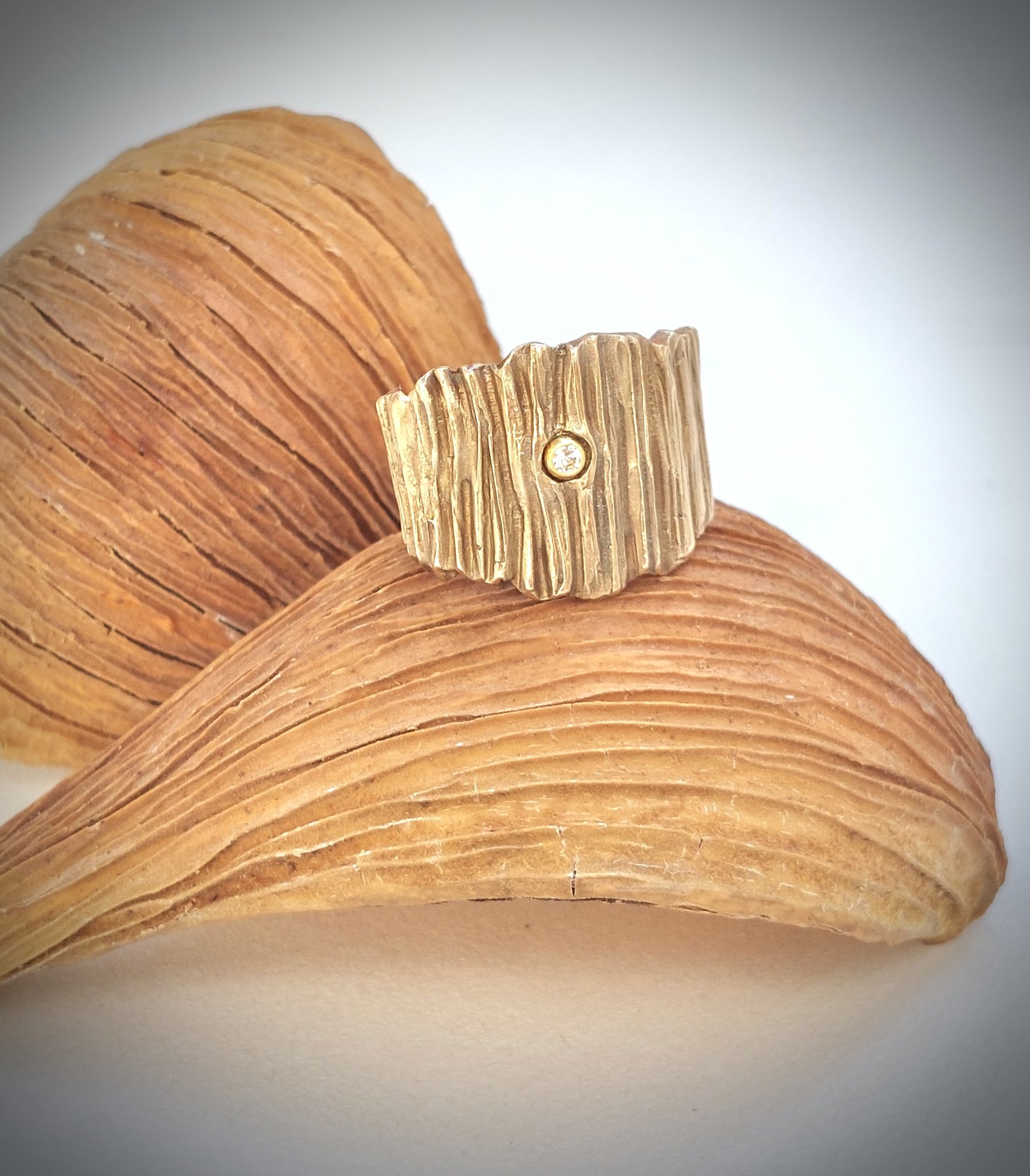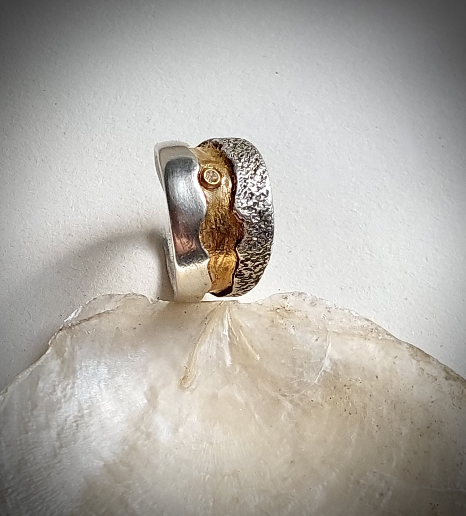 Viento - Deze aparte organische zilveren ring heeft donker gepatineerde golvende bewegingen. Alsof de wind waait over het water en haar rimpelingen achterlaat. Zij is afgewerkt met een schitterend diamantje in gouden zettng. Uniek van ontwerp en volledig, net als alle overige sieraden van La Haye Jewelry handgemaakt in Nederland.