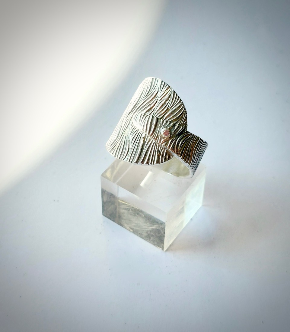 Corteza III - Deze aparte zilveren ring heeft een prachtig bewerkte huid en is afgewerkt met een fijn Swarovski kristalletje in een zilveren zettinkje.