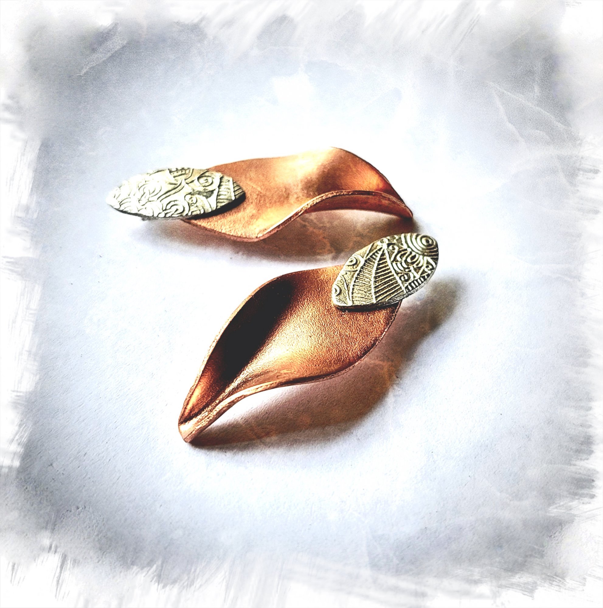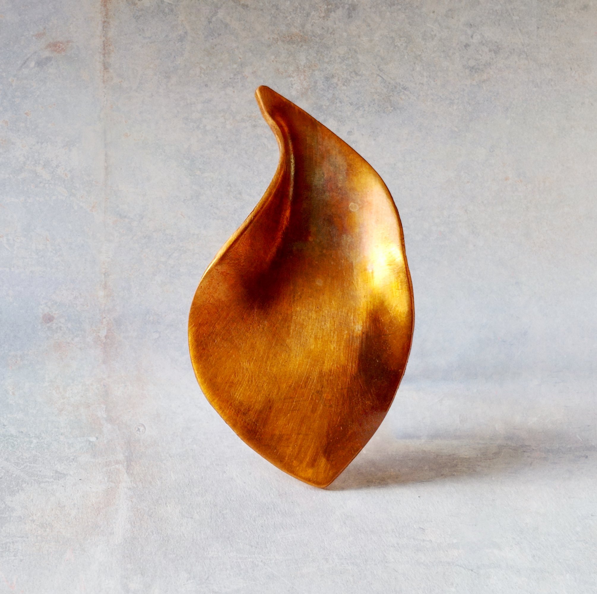 Falling Leaves - Prachtig vormgegeven broche in flame heated Copper, wat de intense gloed geeft. Dmv zilveren broche speld bevestigd aan de kleding. De herfst met zijn gekrulde baderen, in vele prachtige kleuren, teder en zacht of krachtig en vurig is een verrukkelijke inspiratiebron. Opvallend en stijlvol sieraad. Ook eventueel verkrijbaar als hanger. You light up my day