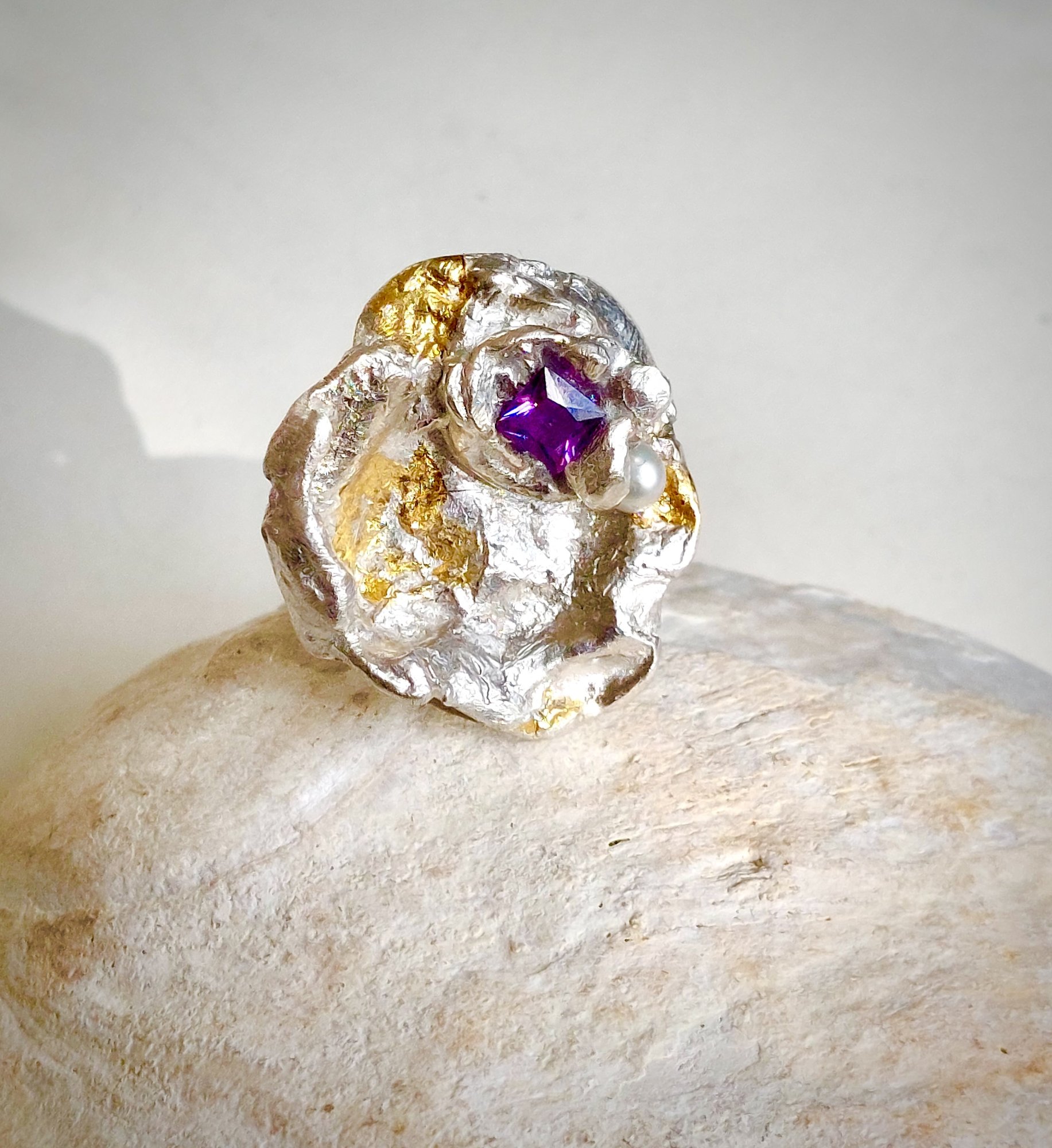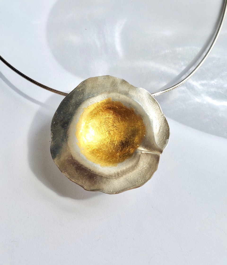 Morning Glory - Zilveren organische hanger met warm 24 karaat goud afgewerkt. Een bijzonder mooi collier. Een musthave voor je collectie. Het sieraad wordt geleverd aan een mooie soepel vallend zilveren Omega collier. Maak je outfit compleet met de bijpassende oorhangertjes en ring Morning Glory. 'the promiss of a new era'