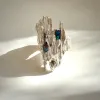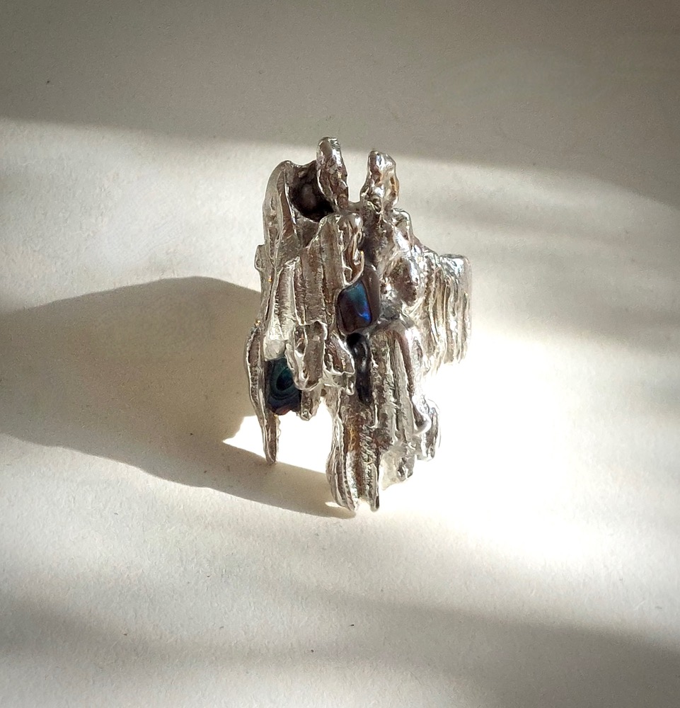Cathedrale I - Exclusieve zilveren handgemaakte ring met Paua Shell en pareltje. Deze bijzondere ring is vervaardigd uit gecast zilver. Zilver wordt verhit tot smelttemperatuur en daarna gegoten in, in dit geval in een strobundel, die vervolgens verschroeit. De grillige zilveren elementen die zo ontstaan kan ik daarna verwerken tot het sieraad. Een bewerkelijk maar boeiend proces. Elke ring krijgt zo zijn totaal unieke uitstraling. Een statement aan je hand. Een echte eyecatcher!