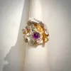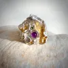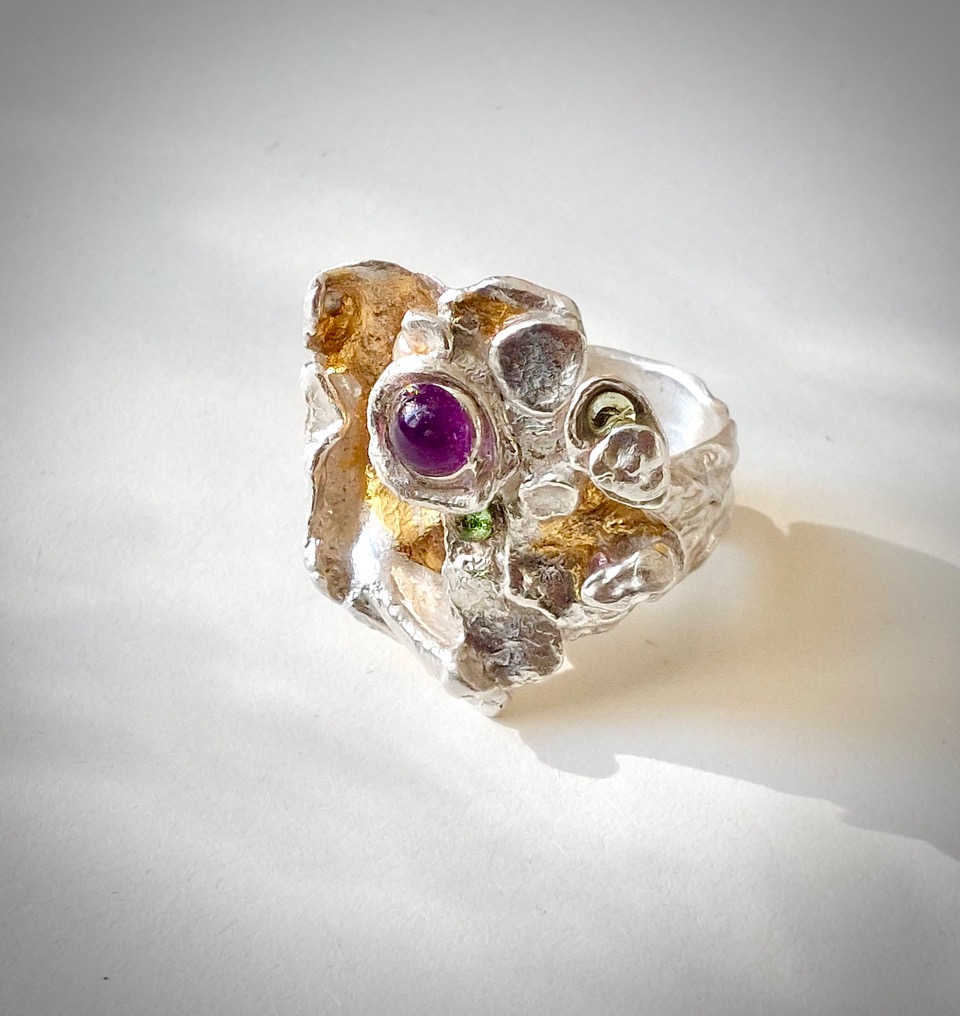 Ngoa - Deze exclusieve zilveren ring is verrijkt met een alloy van 24 krt goud, amethist, grillig gevormd zoetwaterpareltje en 2 kristalletjes. Deze magische ring is vervaardigd uit gecast zilver. Betoverend, bijzonder, uniek en one of a kind. Door het proces van het casten van het zilver is elke ring uniek. De ring kan op 2 manieren gedragen worden en is verstelbaar in maat.