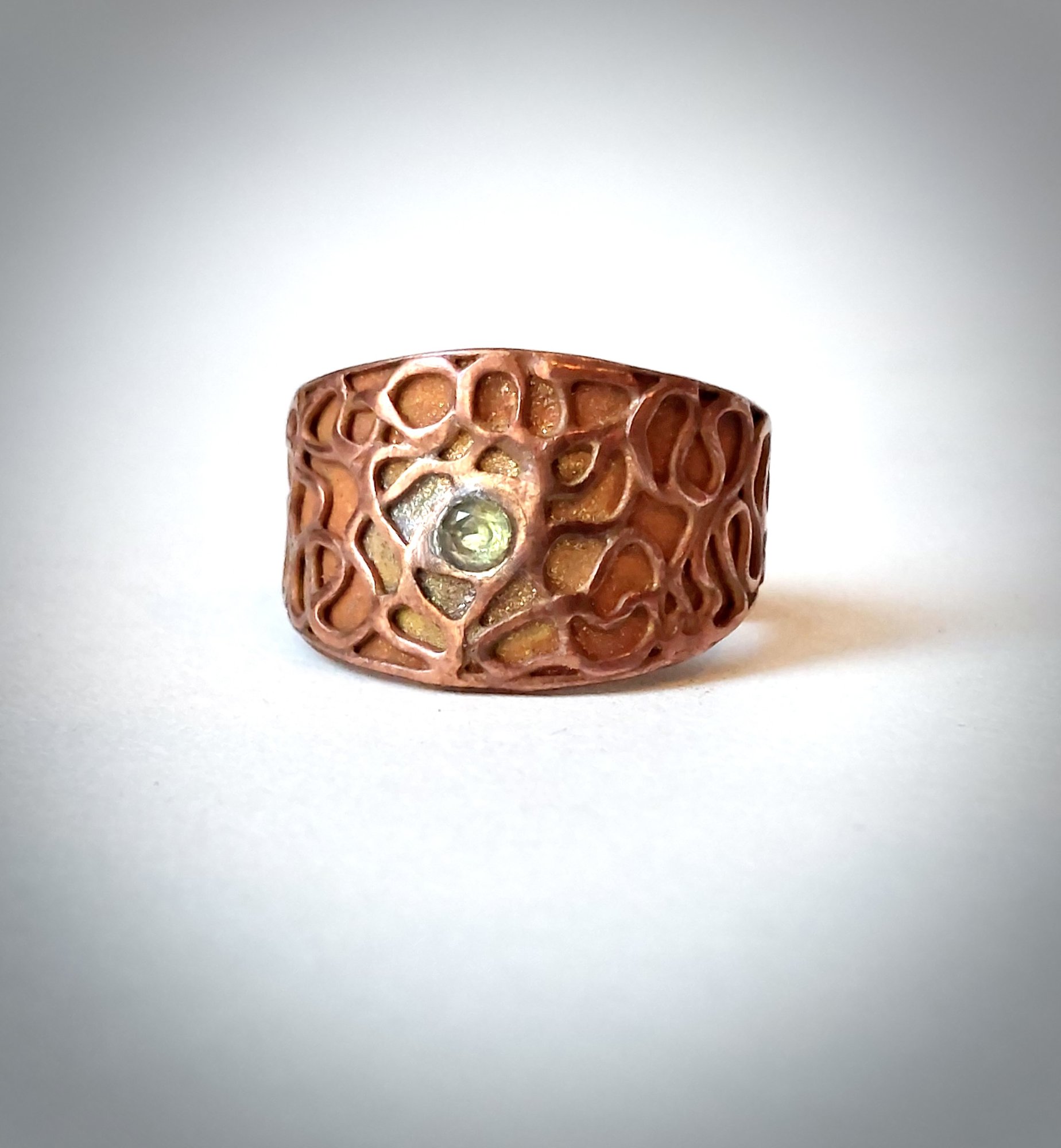 Copper Magic lll - Een unieke handgemaakte koperen ring met glanzend koperen lijnen die het gematteerde oppervlak sieren. Een groene Peridot geeft deze ring een schitterend accent. Aan de bovenzijde van de ring is subtiel een lichtgroen patina aangebracht.. Koper is mooi om te dragen en heeft een geneeskrachtige werking. Denk aan de koperen gezondheidsarmbanden van vroeger. Lees HIER meer over het dragen van koper.