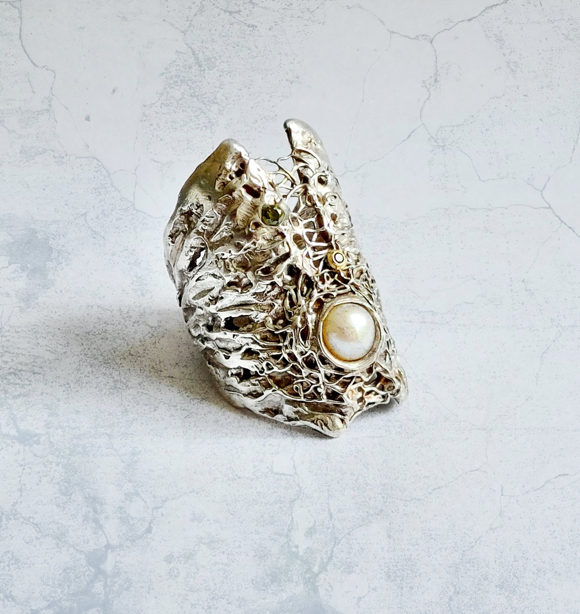 Empress - Prachtige zilveren ring met parel, peridot en safiiertje in gouden zetting. De ring kan op bestelling worden gemaakt. Alle ringen worden handgemaakt en zijn uniek. Er kan een klein verschil zijn met de ring op de getoonde afbeelding. Andere stenen kunnen er op verzoek ook in worden geplaatst. Het is een gesloten ring, niet verstelbaar en wordt op maat gemaakt. Love rules my world