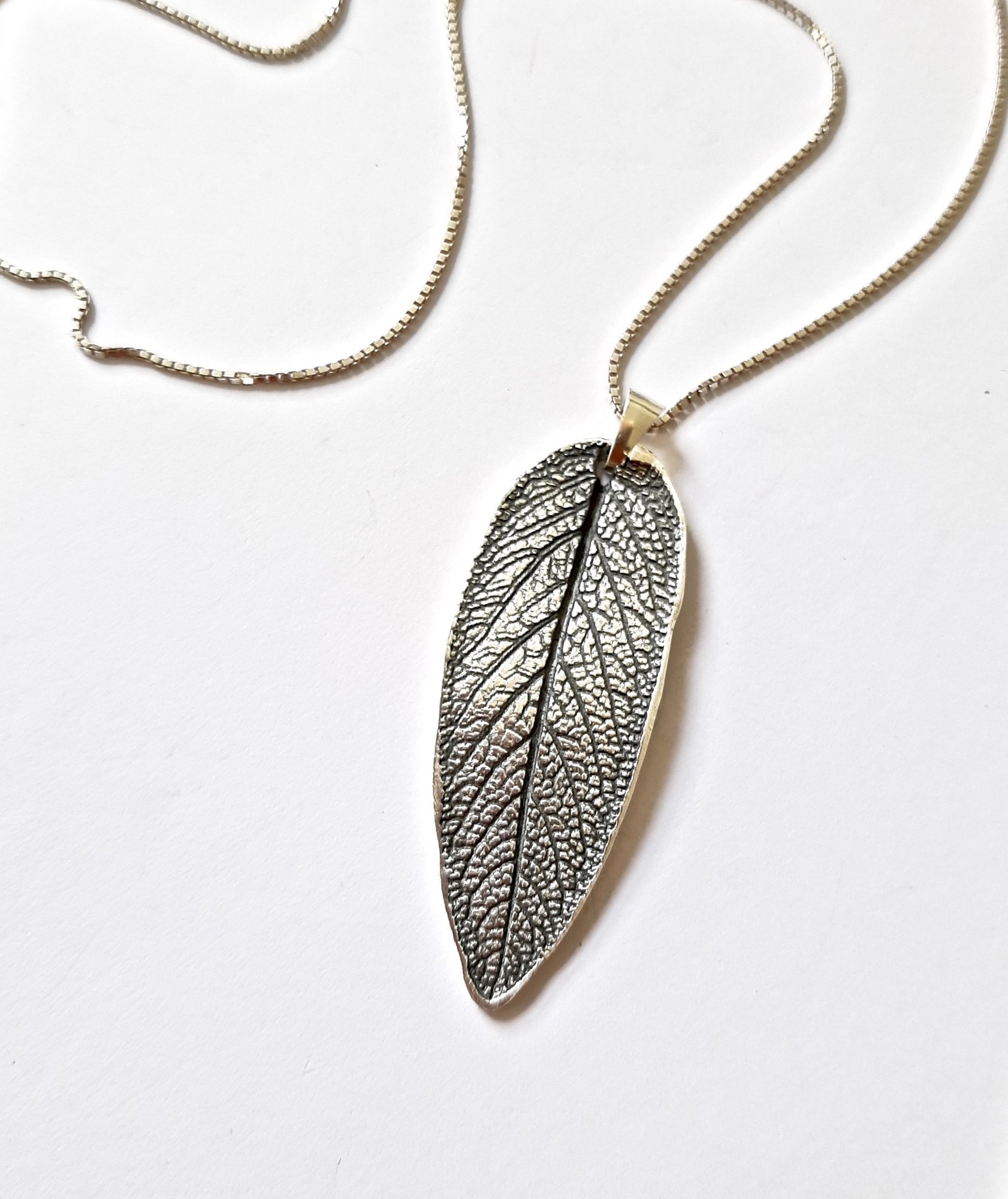 Sage - Zilveren bladvormige hanger met patina afdruk van het salieblad. Salie reinigt en staat symbool voor een nieuw begin. Het zilveren salieblad wordt geleverd met een zilveren kettinkje. Deze aparte handgemaakte zilveren hanger is een perfecte match met de bladvormige zilveren ring Sage. De ring is aanpasbaar in maat en draagt super! You can always make a new beginning
