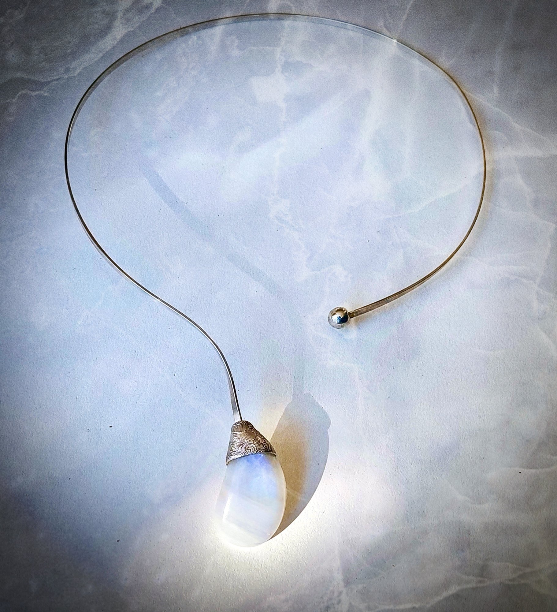 Luna Flora - Lieflijk organisch gevormde zilveren hanger met Maansteen. Draag de zachte vrouwelijke energie bij je en versterk je intuitie. De hanger wordt geleverd aan een mooi soepel vallend Zilveren omega collier. Deze hanger kan in verschillende formaten worden gemaakt.