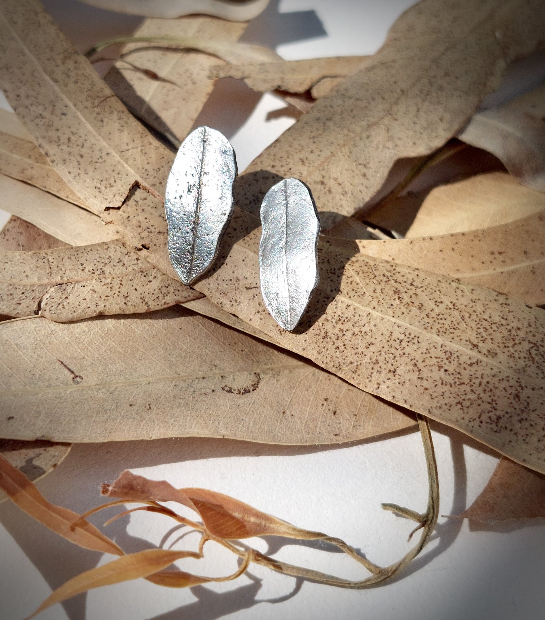 Eucalyptus - In overweldigende hoeveelheid vind je de Eucalyptus bladeren op het strand in Griekenland. Elk blad steeds weer net anders gevormd, al komen ze van dezelfde bron. De sierlijkheid en eenvoud van dit blad is wat mij aanspreekt. Deze zilveren oorbelletjes heb ik gemaakt met de eucalyptus als inspiratie. Licht gepatineerd zodat de structuur zacht zichtbaar is. Ook colliers, zilver met 24 krt goud zijn te vinden op deze site met de eucalyptus als inspiratie zoals de Primavera. Nog verder aangevuld met edelstenen en parels.
