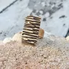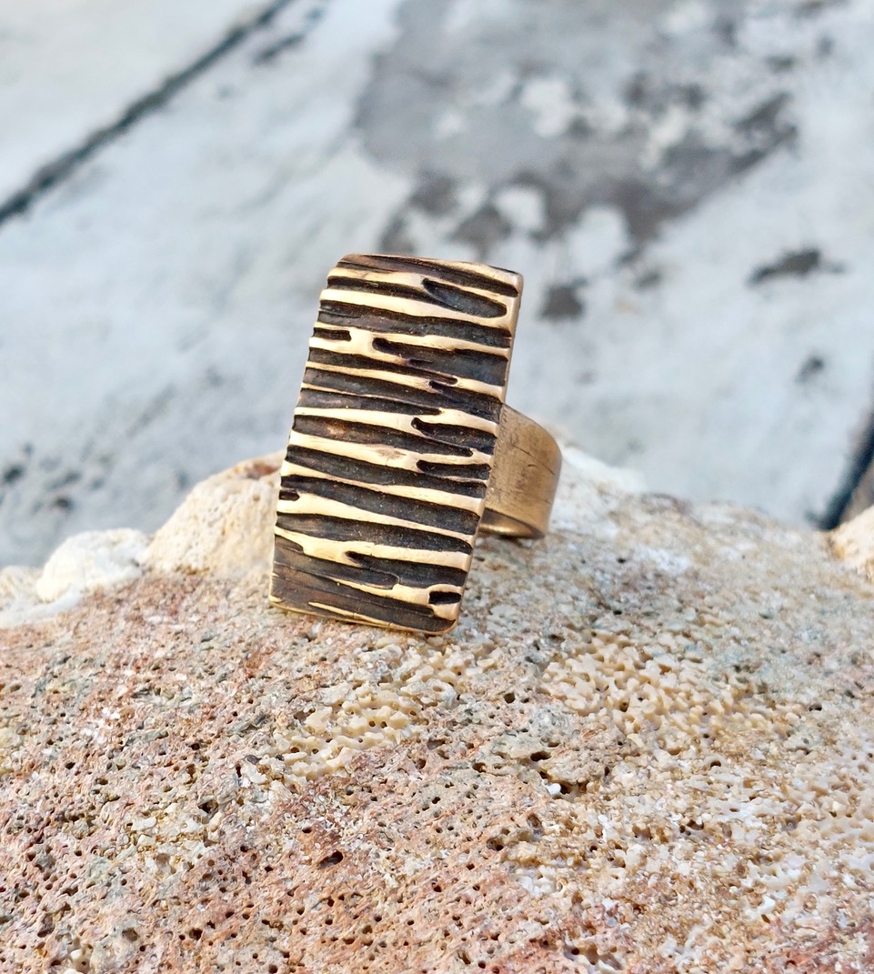 Yoruba - Deze goudkleurige bronzen designring heeft een prachtige warme uitstraling. De cannelures zijn donker gepatineerd en geven deze eigentijdse ring een stoer effect. Combineer je ring met de stoere oorbellen Yoruba!