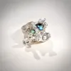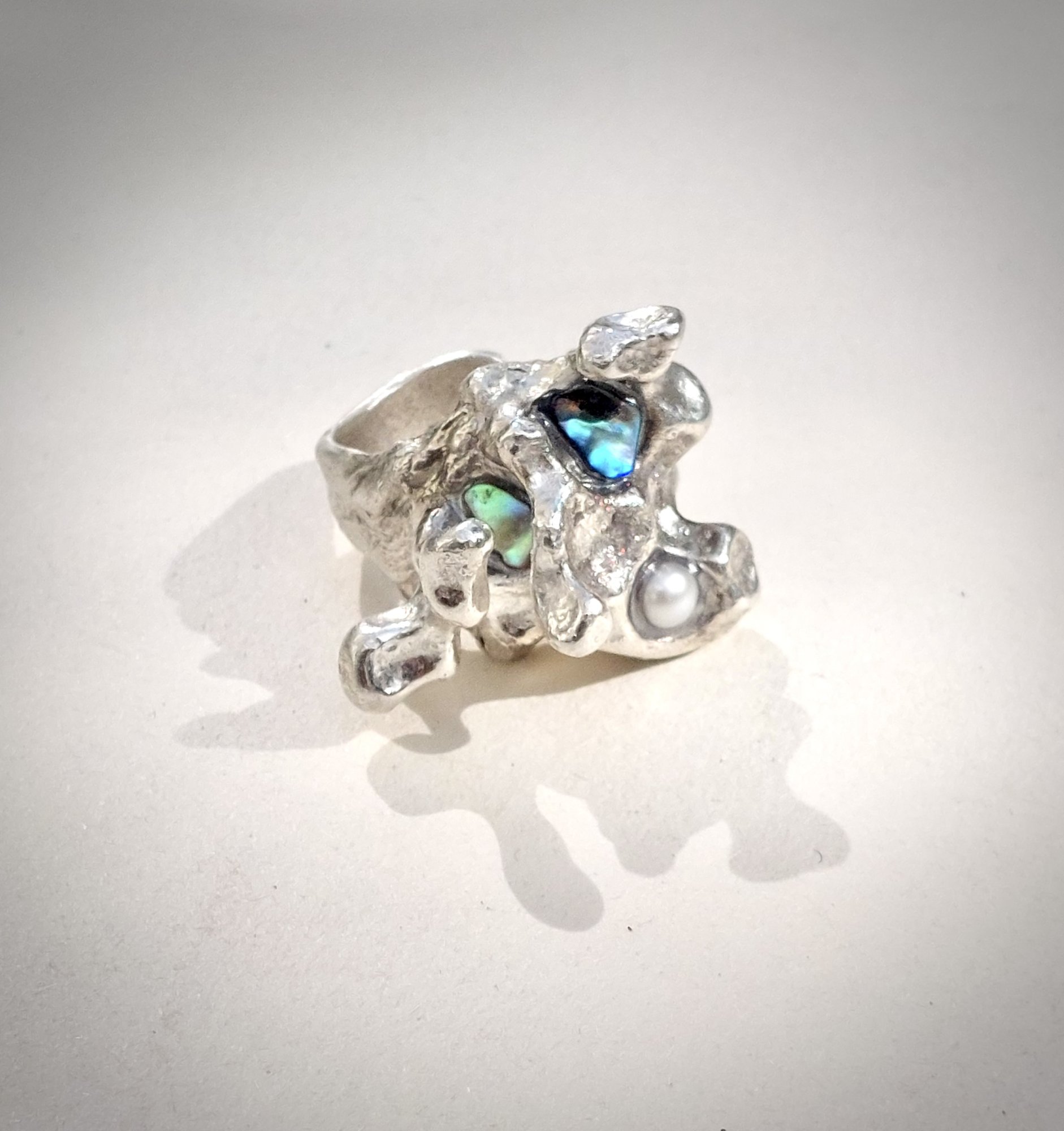 Maggiore - Zilveren exclusieve artistieke ring met parel en schitterende elementen van de groen/blauwe parelmoer Paua shell. De ring is gemaakt dmv het casten van zilver. Lees HIER meer over deze bijzondere techniek. Een unieke statement ring handgemaakt voor jou! Dare to be different