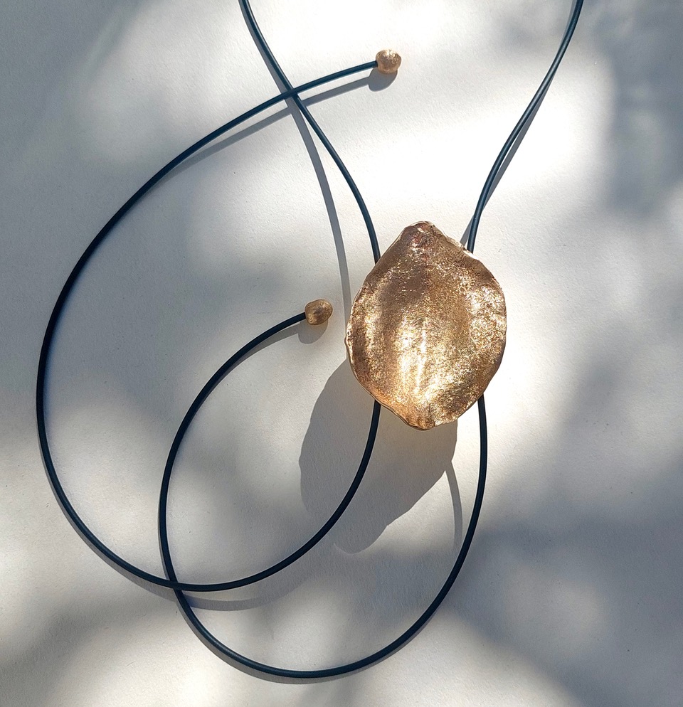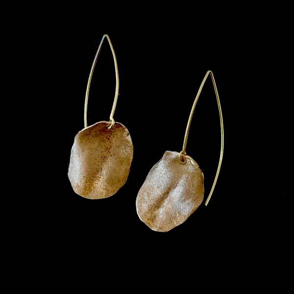 Jacaranda - Aparte goudkleurige oorstekers van brons. Organisch en opvallend van textuur. Vormt een set met Jacarande hanger aan zilveren collier met zwart rubberen sluiting. Het sieraad is gevormd en geinspireerd door de Zaden van de Jacarande boom nadat deze in bloei heeft gestaan met zijn prachtige lilabloemtoortsen. FLowers en seeds meet my needs