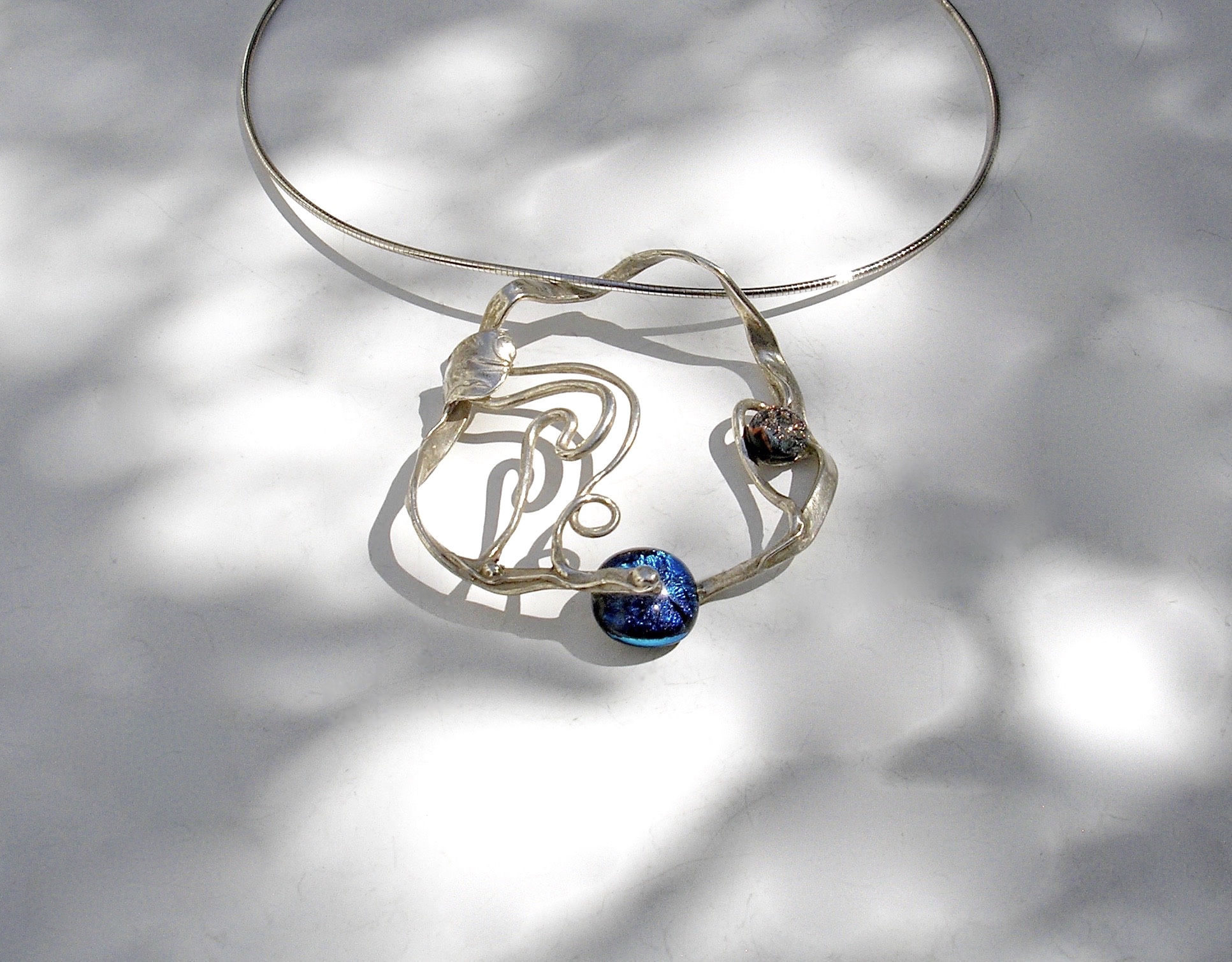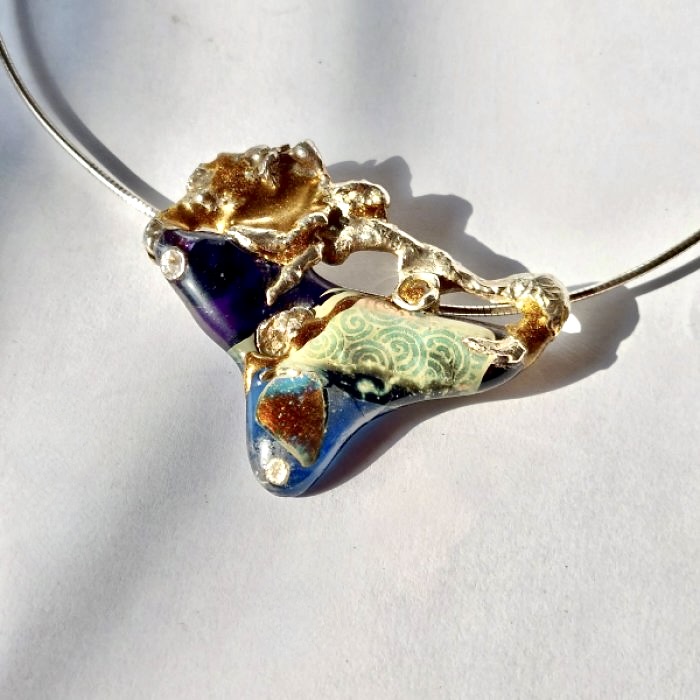 Corelli - Bijzondere zilveren smash cast hanger van in eigen atelier gefused glas en mineraal. Deze elegante Art Nouveau hanger met magische kleuren is artistiek, bijzonder, baroque en 'One of a Kind'. De hanger wordt geleverd aan een rond soepel vallend zilveren Omega collier. Het zilver in deze hanger is zeer hoog verhit waardoor het vloeibaar wordt en daarna gecast in koud water wat het zilver doet stollen in grillige vormen. De vormen die hierdoor ontstaan zijn vervolgens gecombineerd met het gefusede glas. Dit is opnieuw gezamelijk verhit, waardoor het zilver met het glas samensmelt. Een bewerkelijk en fascinerend procede wat tot dit prachtige sieraad heeft geleid. As special as you are