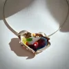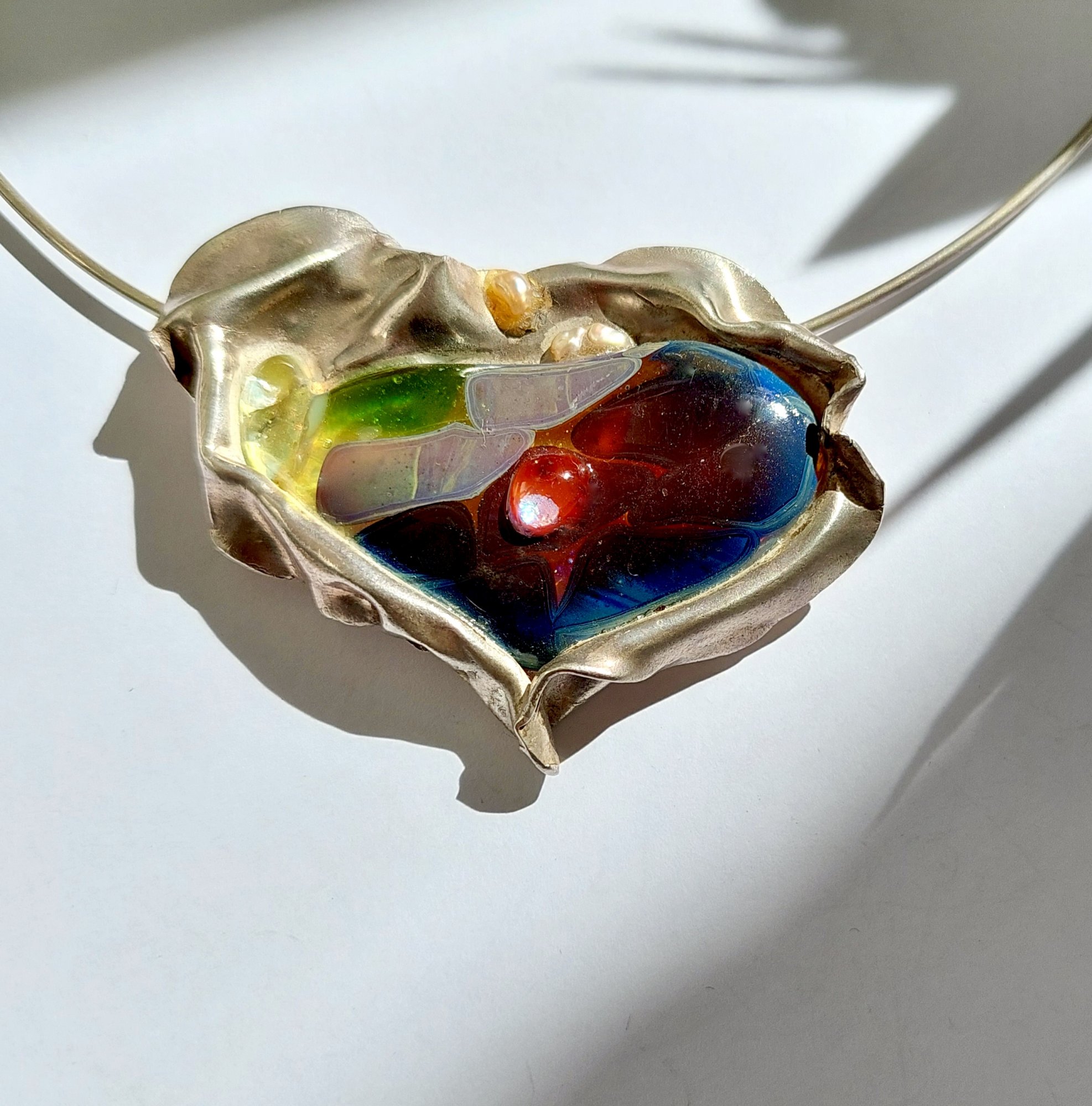 Capella - Een opvallend collier met kleurrijk gefused glas en parels. Deze organisch gevormde hanger wordt geleverd aan een rond soepel vallend zilveren omega collier. De betoverende kleuren van de bijzondere glassoorten gecombineerd met de aparte zilveren zetting en parels, geven dit sieraad een exclusieve en artistieke uitraling.