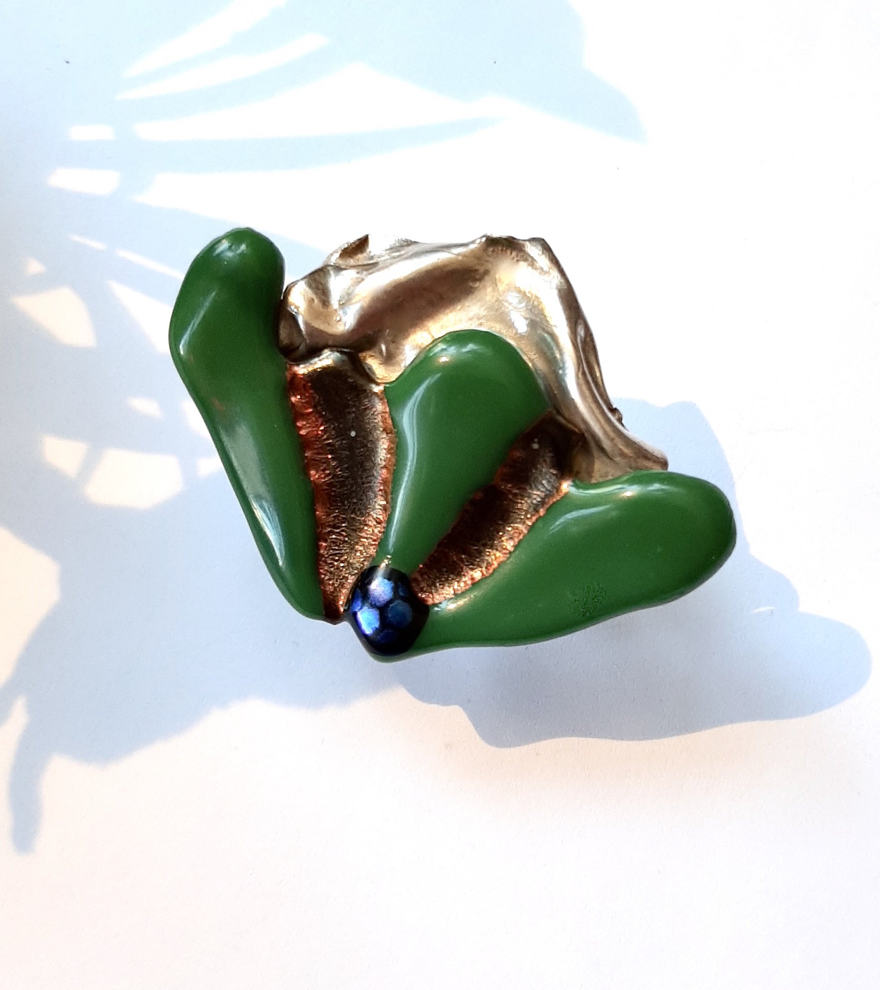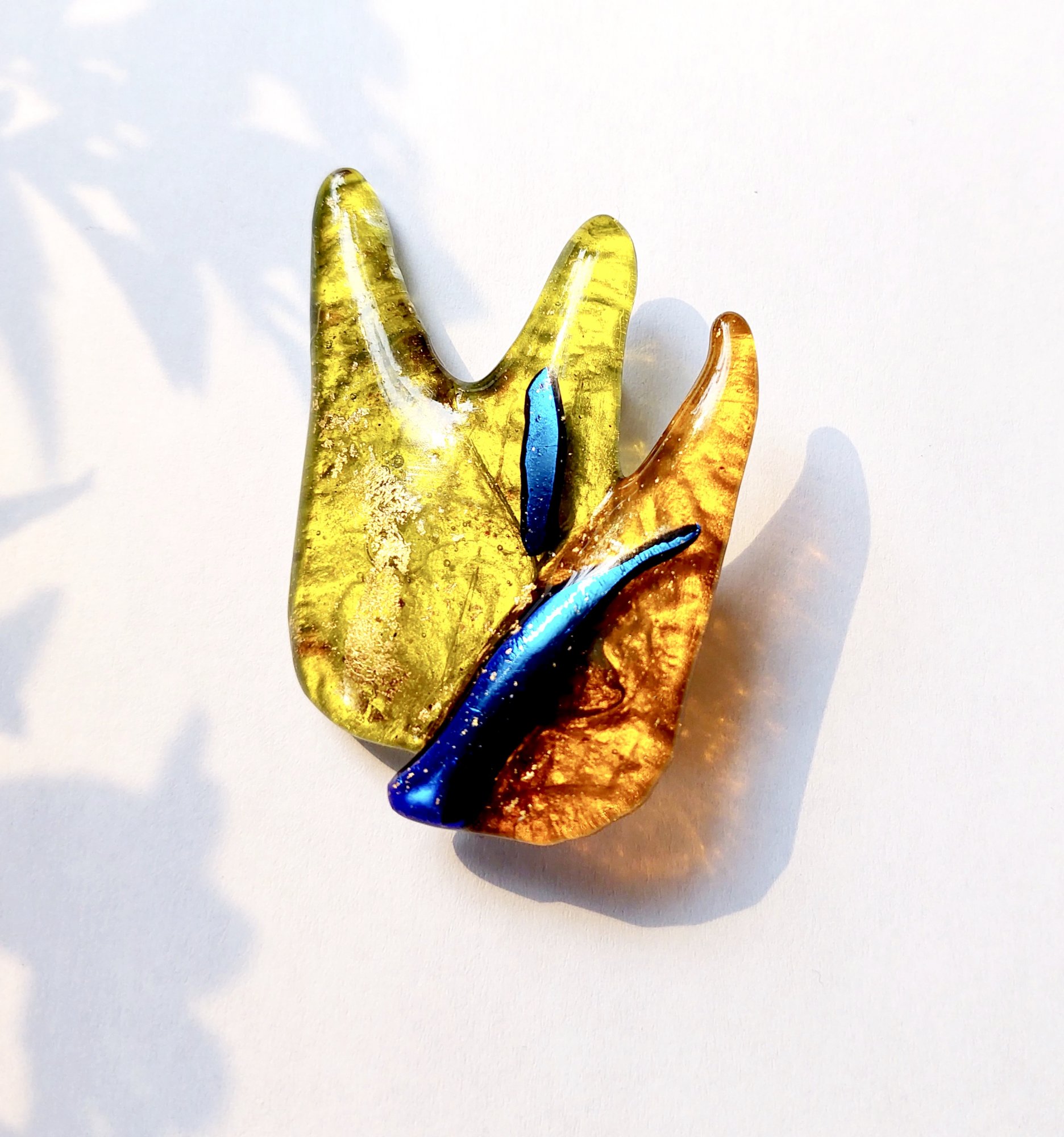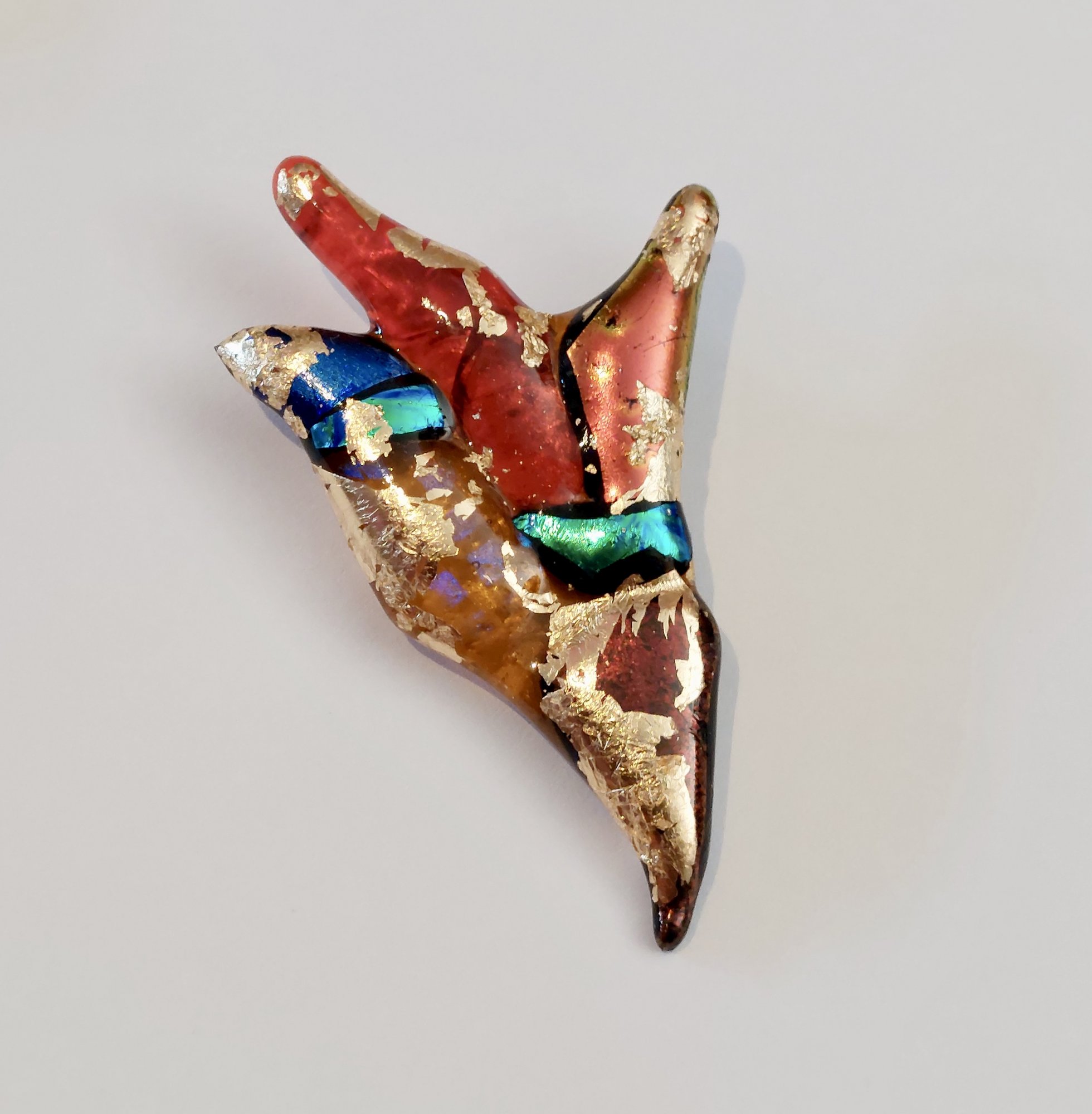 Veneto - Schitterende kleurrijke broche gemaakt van in eigen atelier gefused glas, afgewerkt met bladgoud. De blauwgroene tint van de dichroic elementen doen denken aan het Canal Grande in Venezia! Deze glasbroche matcht bijzonder goed bij verschillende kleuren kleding. ..as lovely as you are..