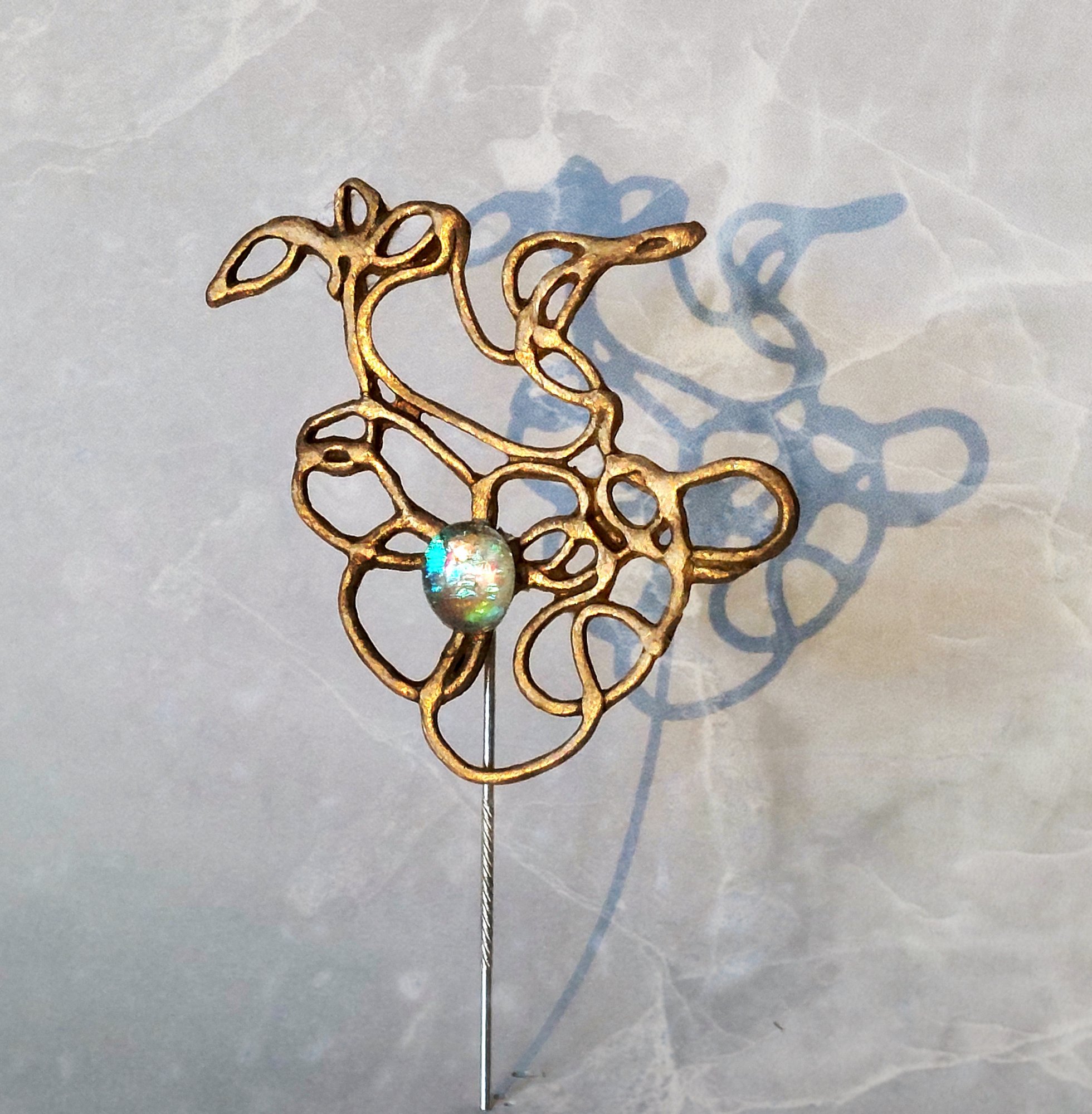 Lange Brochepin XIII - Unieke handgemaakte bronzen sierspeld of lange pin broche, verrijkt met een sierlijke zelfvervaardigde dichroic glasparel. De lange reverspin, die lijkt op een hoedenpin, draag je tegenwoordig op een sjaal, truitje, vest of jasje. De pin heeft een stevig stoppertje aan het uiteinde, om te zorgen dat je hem niet verliest!