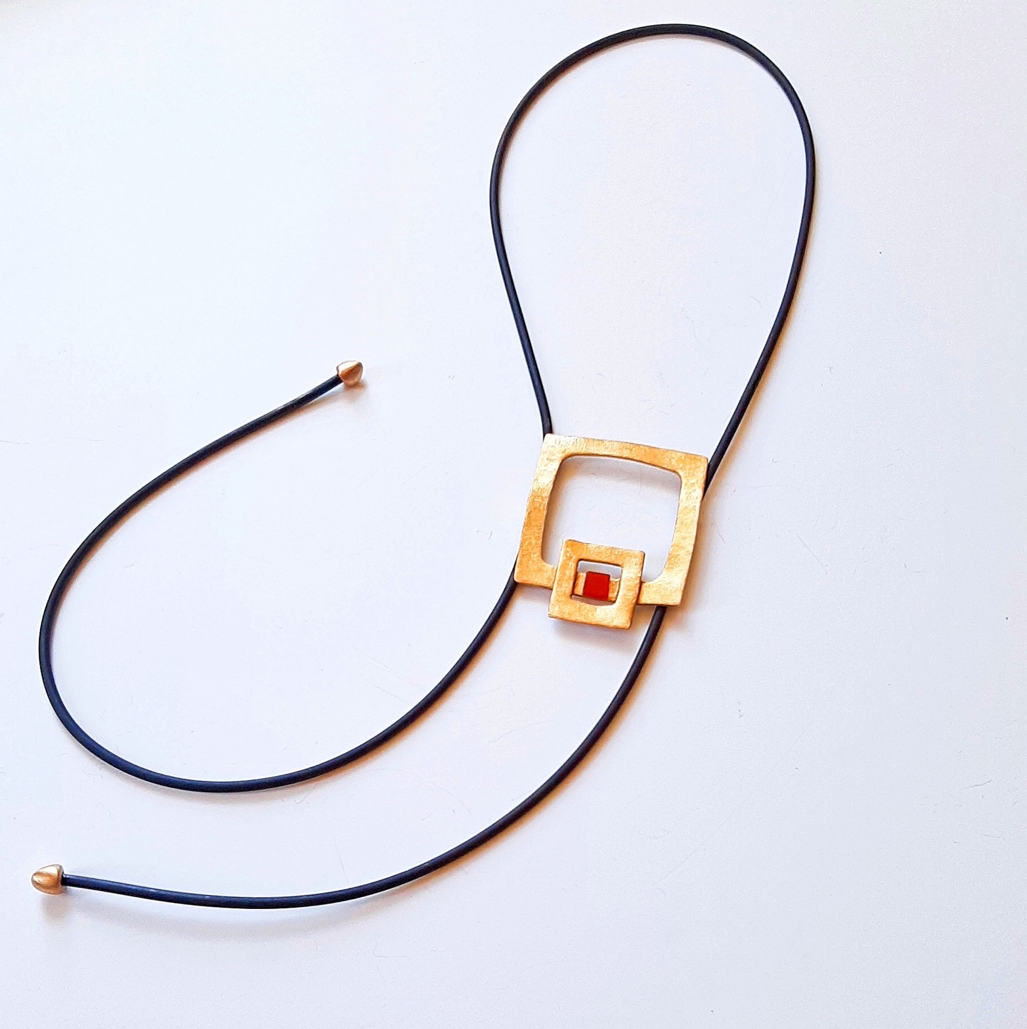 CoCo Cornaline - Goudkleurige Art Deco hanger aan zwarte rubberen veter. De warme goudkleur combineert prachtig met het diepe rood van de Carneool. Chique, elegant en apart collier. Draagt mooi en is in hoogte verstelbaar. Maak je outfit compleet door bij dit aparte halssieraad de oorhangers CoCo te dragen! Betekenis Carneool:Carneool werkt verwarmend. Het maakt scherp & geconcentreerd. Deze steen maakt je vrolijk. Geeft energie en levenslust.