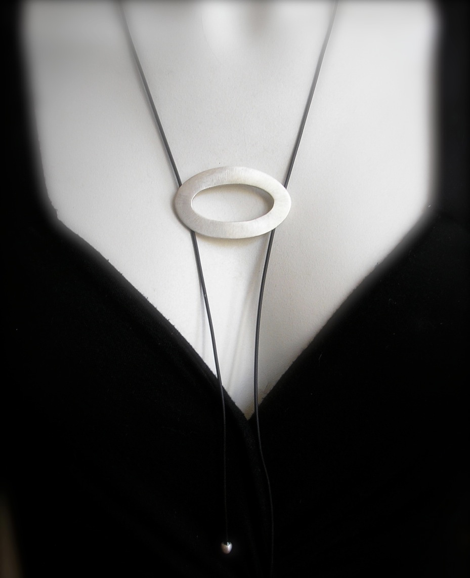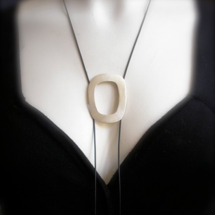 LuNa - Speelse en soepeldragende hanger van een koperen met een zilveren kelkje. Met mooie organische vormgeveing. De hanger kan op elke gewenste hoogte gedragen worden en is gemakkelijk verstelbaar. De zwart rubberen veter is afgewerkt met handgemaakte zilveren pareltjes. Origineel ontwerp, een sieraad om iedere dag te dragen.