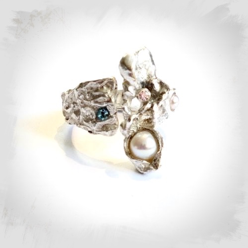 Avonture - Organisch vormgegeven unieke one of a kind zilveren ring met gecaste zilveren elementen. Gelardeerd met parels, Topaas en Swarowski. Exclusief, avontuurlijk en elegant.Een soortgelijke ring zal, vanwege het bijzondere creatie-proces, altijd afwijken van de getoonde afbeeldingen en uniek zijn van ontwerp. Une Avonture, comme vous!