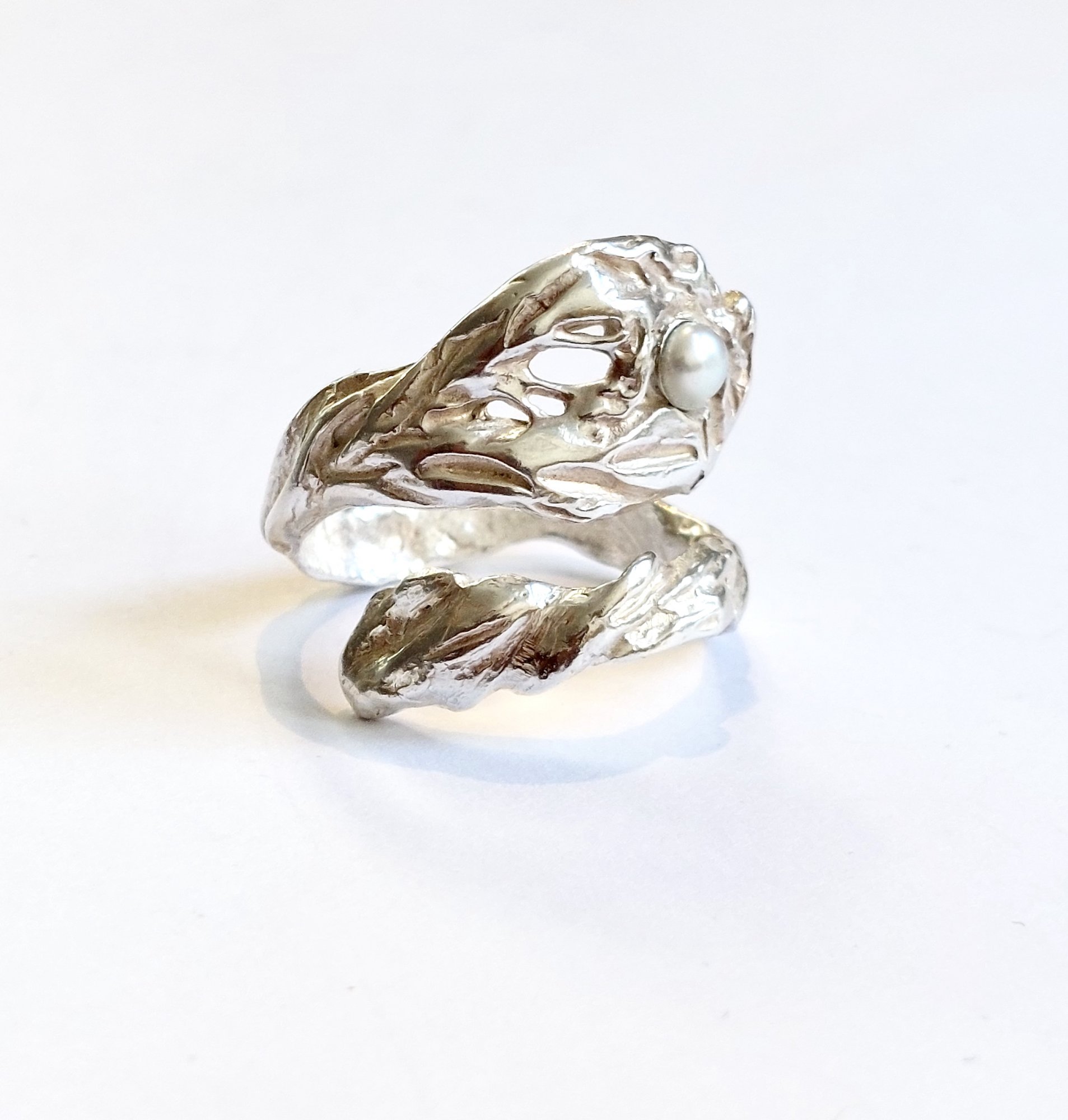 Capella - Een opvallend collier met kleurrijk gefused glas en parels. Deze organisch gevormde hanger wordt geleverd aan een rond soepel vallend zilveren omega collier. De betoverende kleuren van de bijzondere glassoorten gecombineerd met de aparte zilveren zetting en parels, geven dit sieraad een exclusieve en artistieke uitraling.