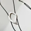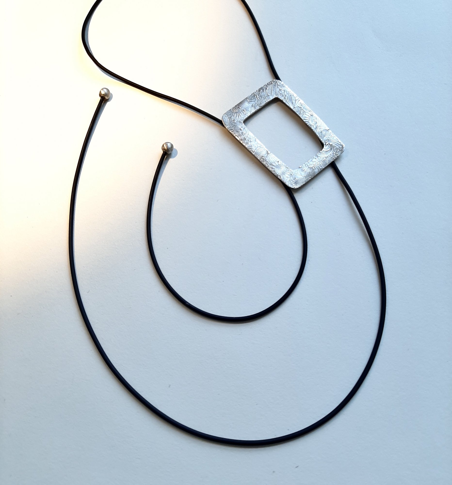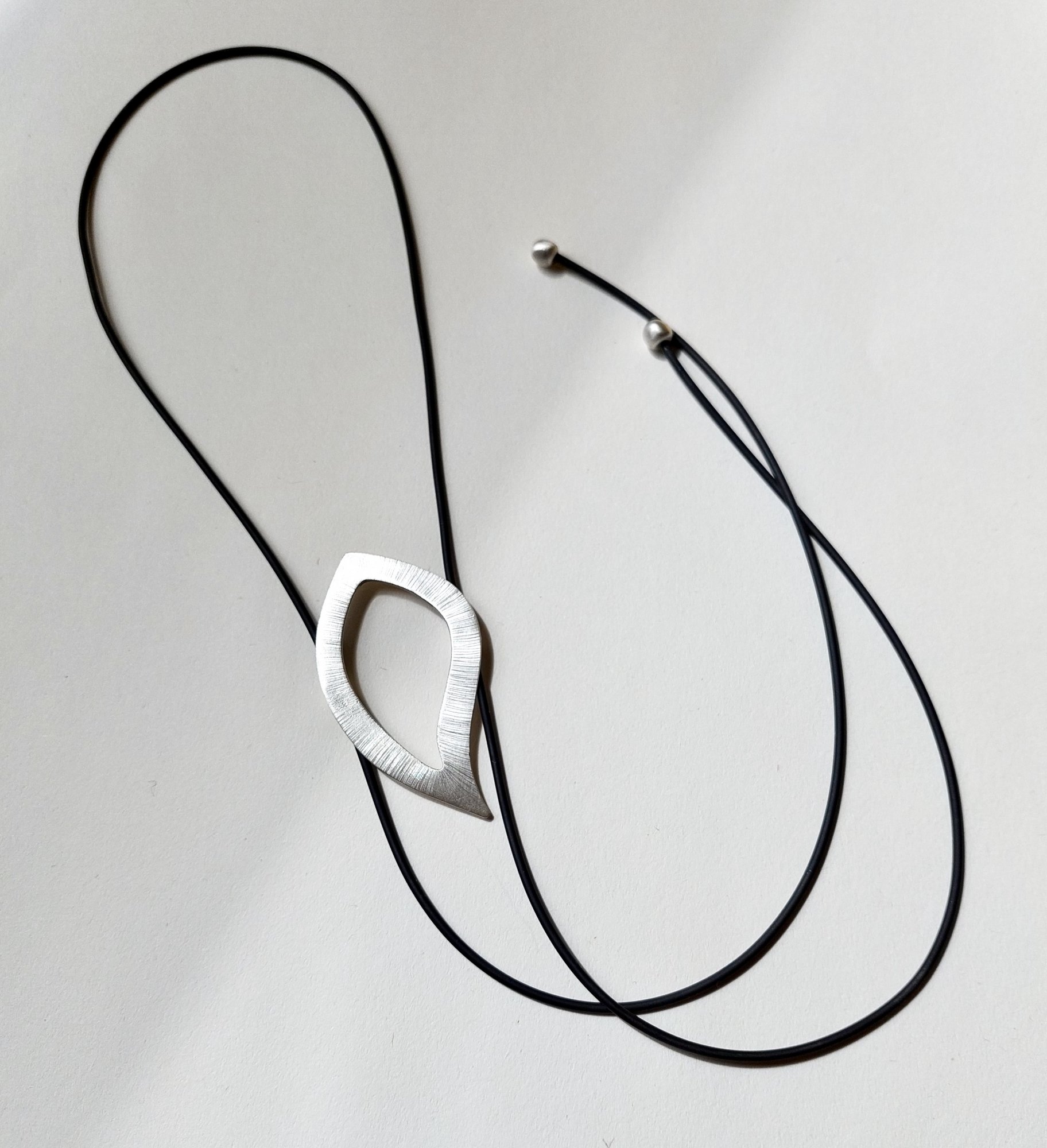 Serendipity - Zilveren hanger aan zwartrubberen veter. Chique, sportief en design! De lengte van de veter is verstelbaar en de hanger kan op elke gewenste hoogte worden gedragen. Strak en prachtig vormgegeven zilveren hanger. Bekijk ook de bijpassende oorhangers.