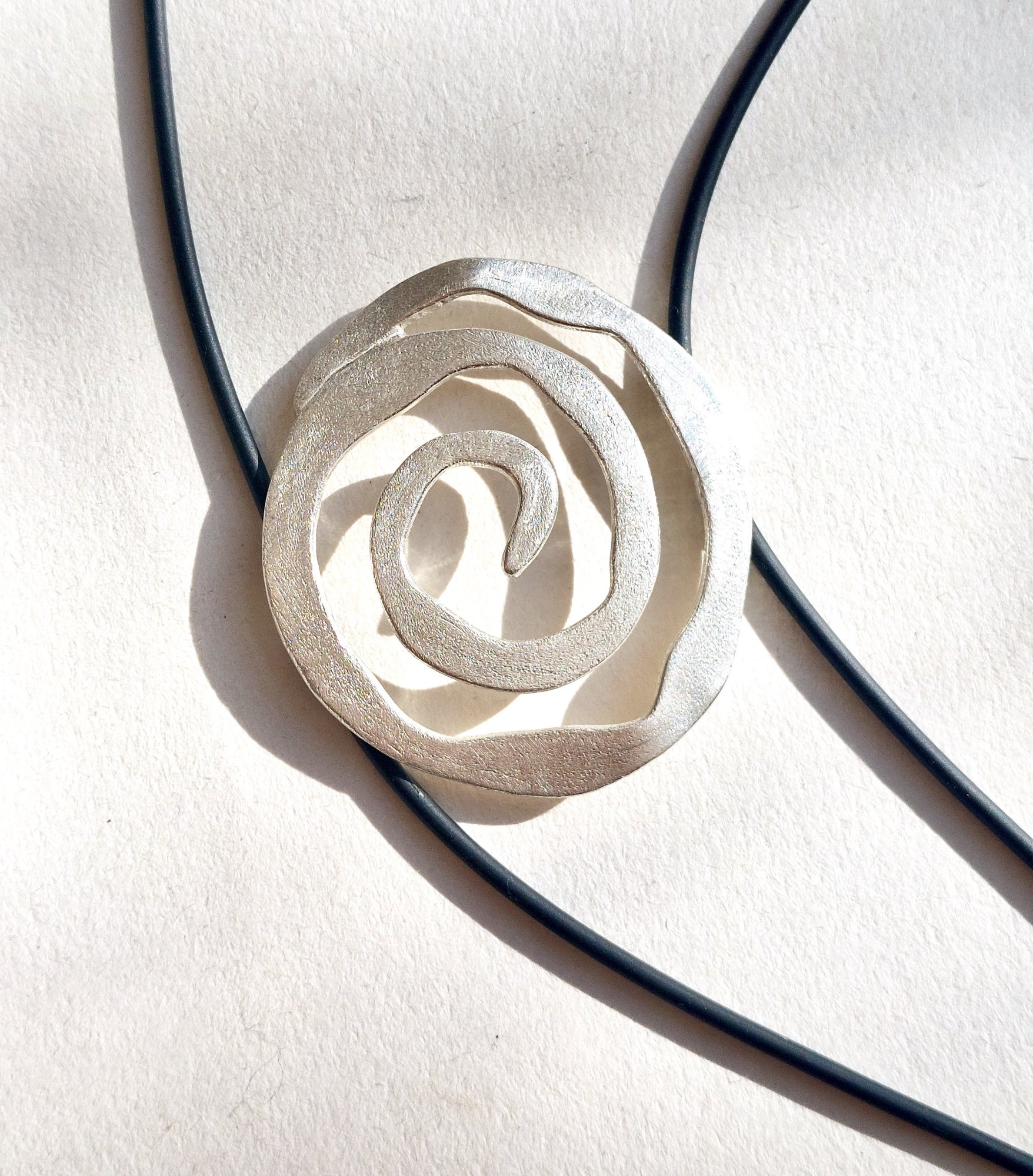 Vortex - De spiraalvorm. De oervorm van alle vormen, de bron, source. Verbind je met jouw source op elk moment van de dag. Dit sieraad herinnert je daaraan. Dit sieraad is vervaardigd uit prachtig gematteerd zilver en afgewerkt met zilveren bolletjes. De hanger is gemakkelijk in hoogte verstelbaar en licht om te dragen. Ideaal bij een hoog gesloten truitje of juist een dress met v-hals, handig door de verstelbaarheid in lengte. De spiraalvormige hanger hangt aan een natuurlijk rubber koord.