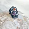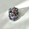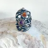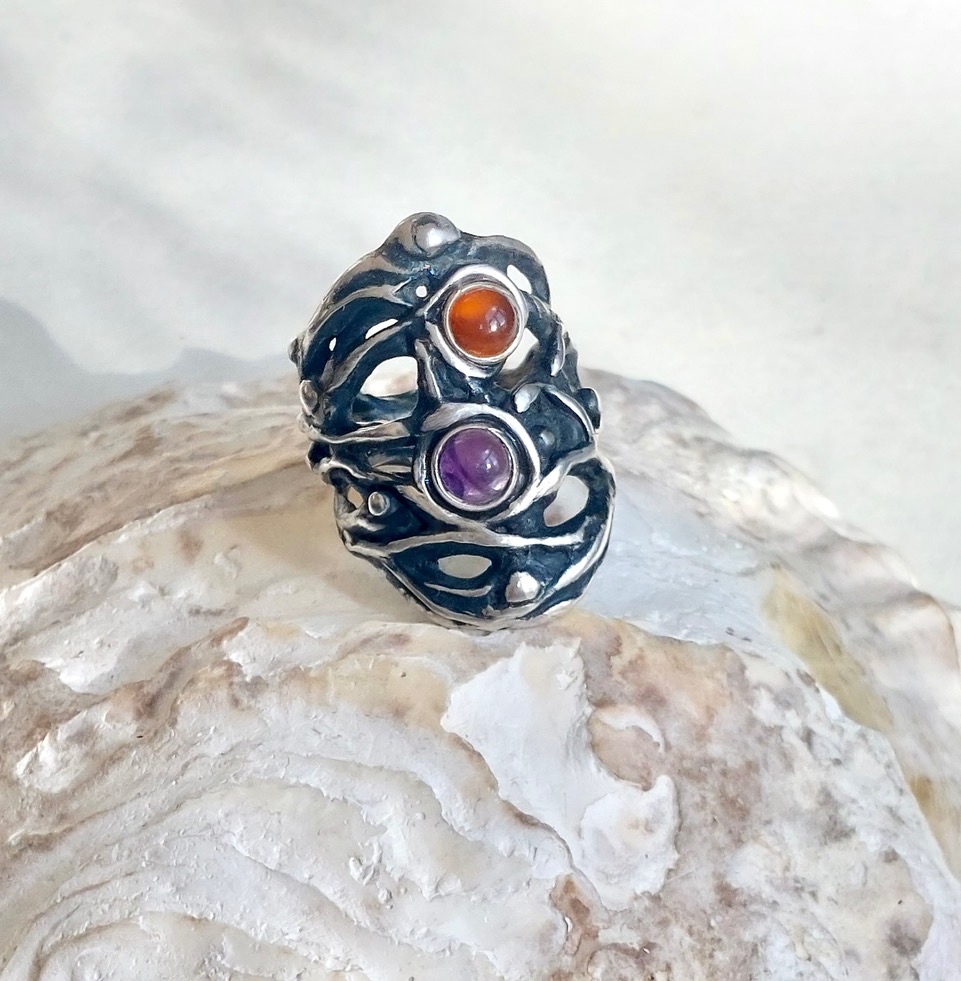 Piegato - Zilveren opengewerkte ring met carneool, ruwe zoetwaterpareltjes en amethist. Een stijlvolle en elegante damesring met een beweeglijk lijnenspel. Deze zilveren handgemaakte ring is verstelbaar van maat.