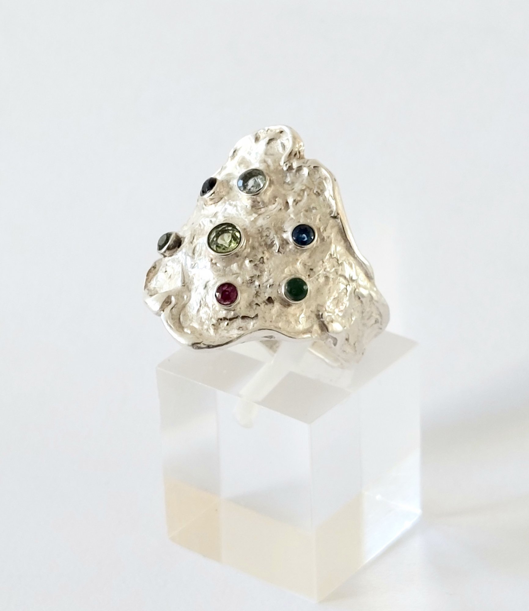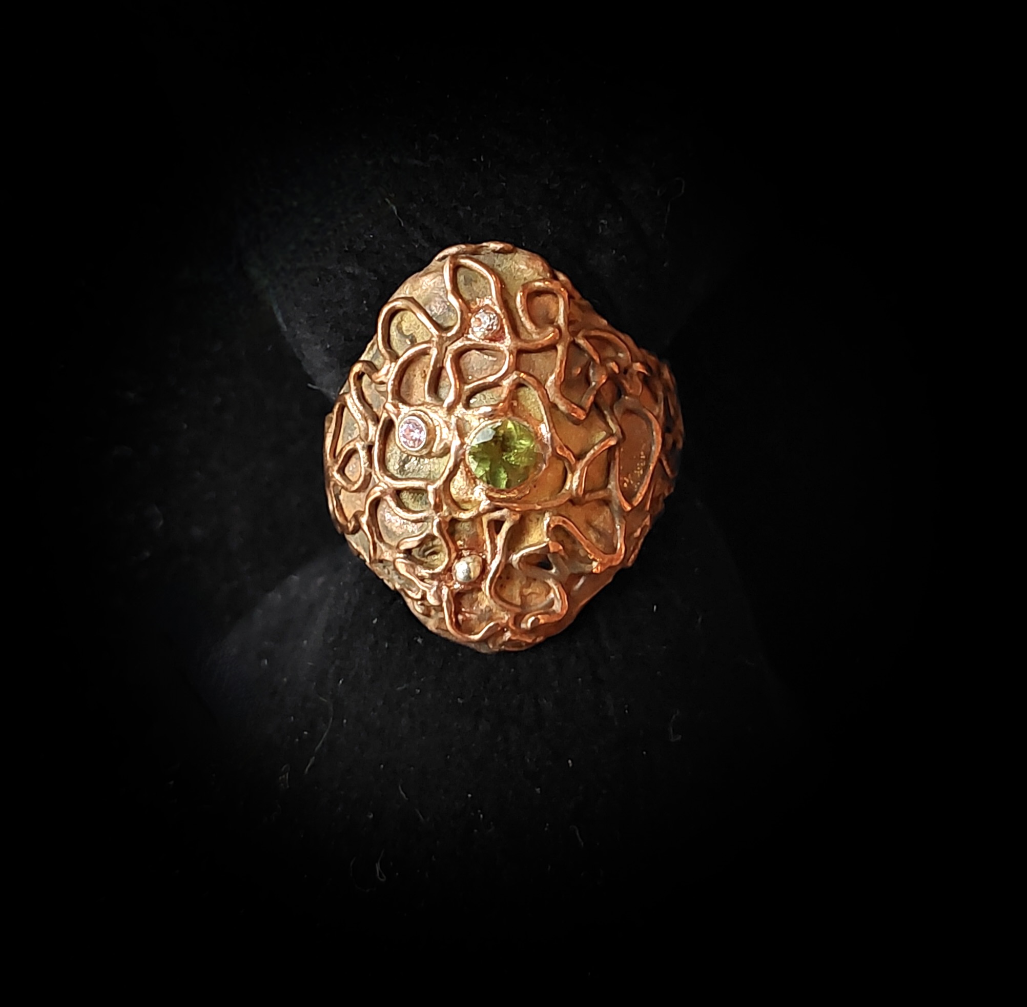 Copper Magic IV - Een grillig gevormde mat koperen ring met golvende glanzende lijnen die het oppervlak sieren. De ring heeft als middelste steen een Peridot, en is verrijkt met 2 kristalletjes en een handgevormd zilveren pareltje. Koper is mooi om te dragen en heeft een geneeskrachtige werking. Denk aan de koperen gezondheidsarmbanden van 'vroeger'. Lees HIER meer. Op alle January Specials 20% korting t/m 8 Februari